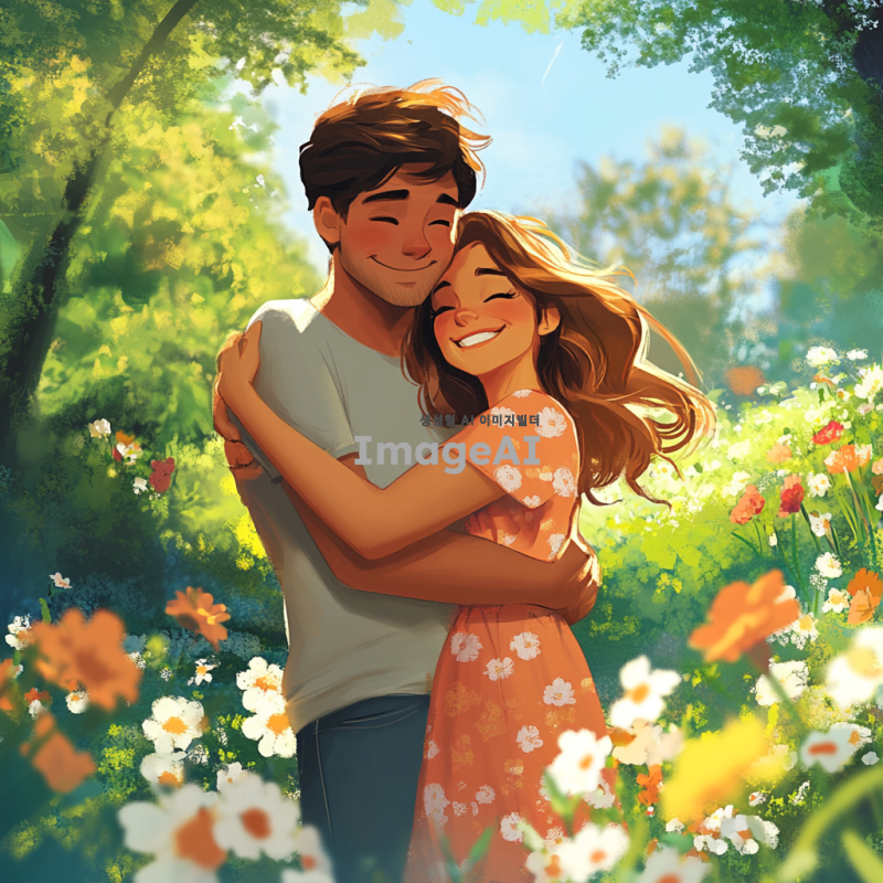 따뜻한 햇살이 비치는 공원에서 남자와 여자가 서로를 안고 있는 장면, 두 사람의 얼굴에는 행복한 미소가 가득하고, 주변에는 꽃들이 만개해 있어 생동감 넘치는 분위기, 남자는 캐주얼한 티셔츠와 청바지를 입고 있고, 여자는 화사한 원피스를 입고 있음. 배경에는 푸른 나무와 푸른 하늘이 펼쳐져 있어 평화로운 느낌을 주는 장면.