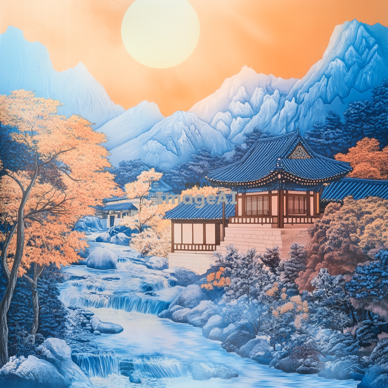 오만원 지폐의 디자인을 배경으로 한 한국의 전통적인 풍경, 푸른 산과 흐르는 강, 그리고 그 옆에 서 있는 한국의 전통 가옥, 따뜻한 햇살이 비치는 모습, 고요하고 평화로운 분위기, 한국의 전통 문화를 느낄 수 있는 요소들을 포함하여 생동감 있게 표현된 이미지.