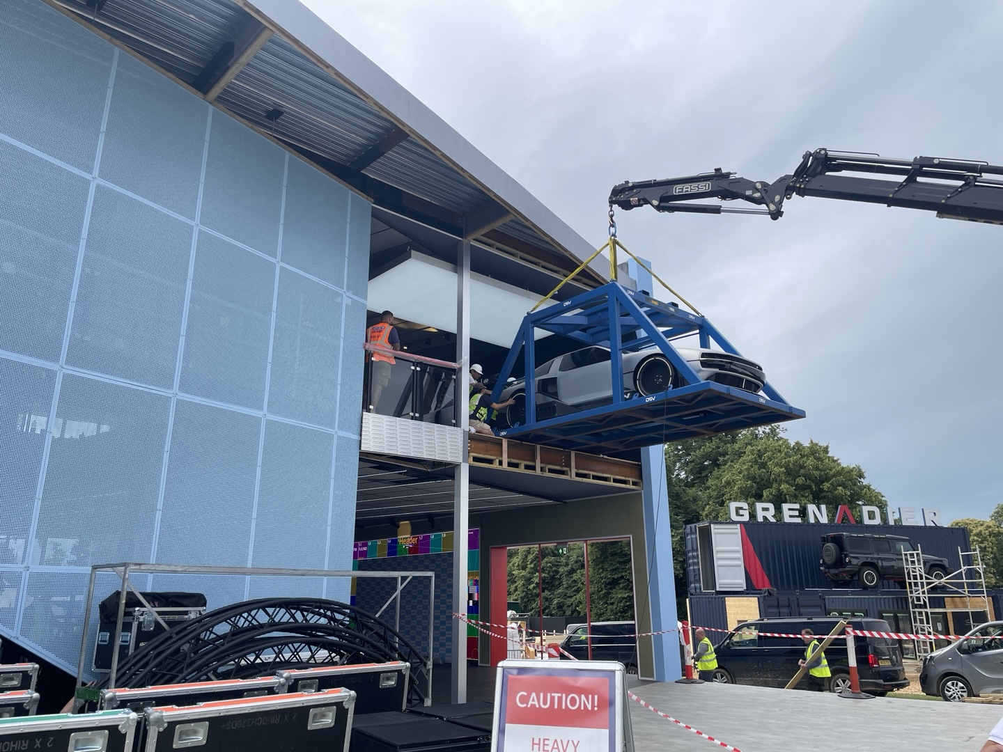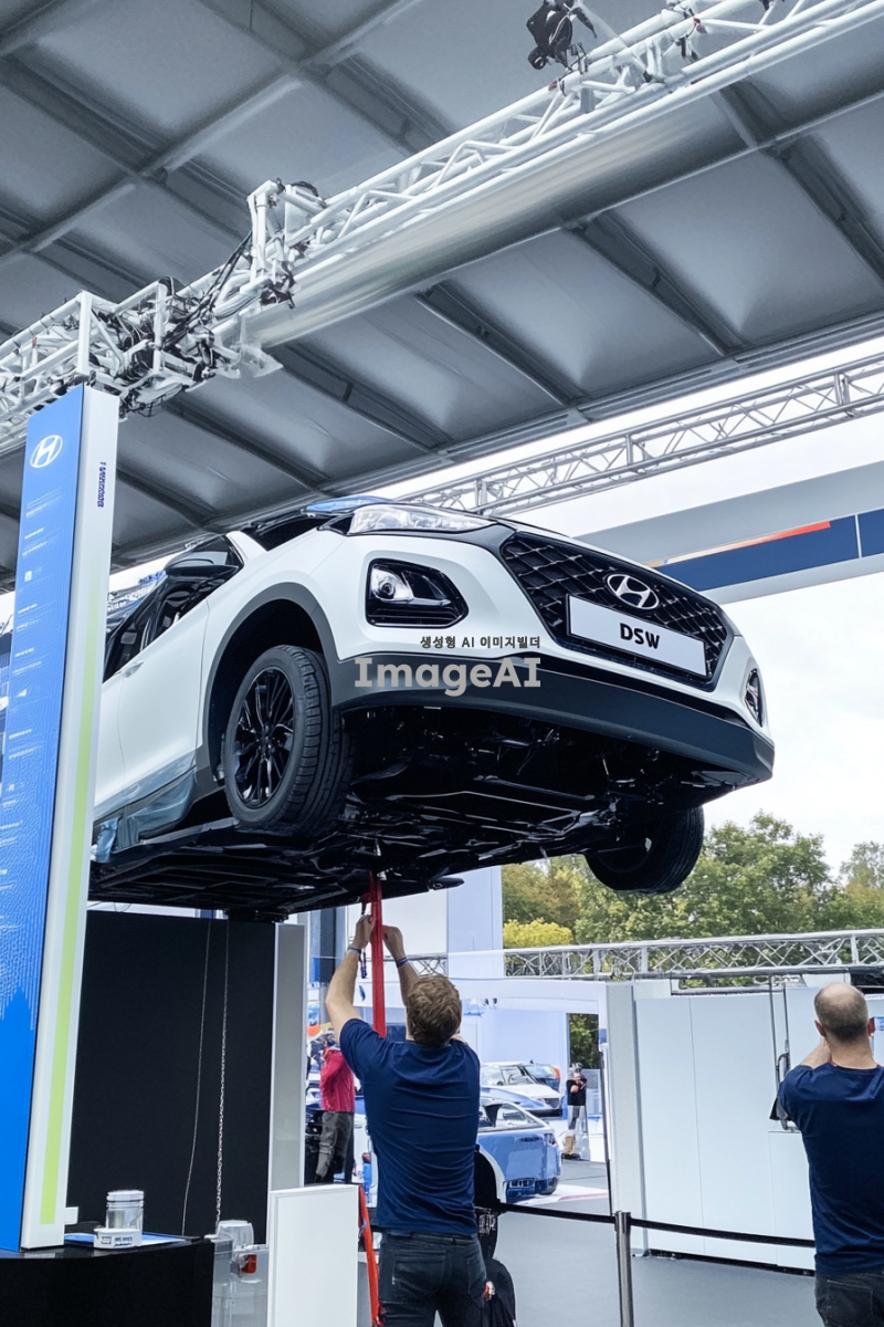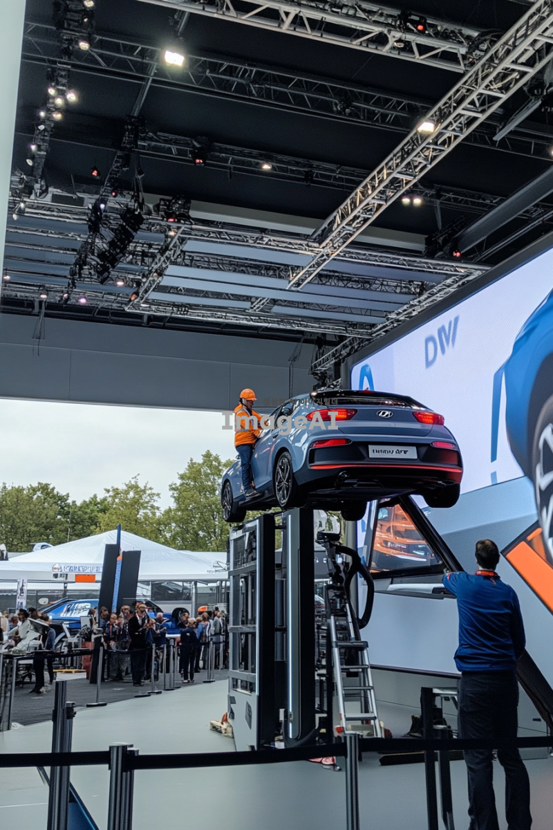 dsv 직원이 모터쇼에서 현대자동차 전시 차량을 부스 위에 포지셔닝하는 모습을 픽사 그림체로 그려줘.