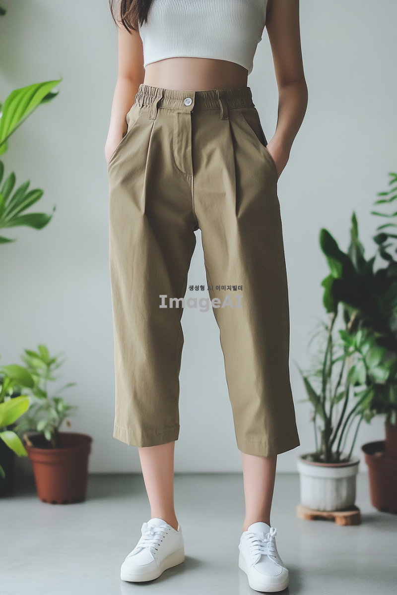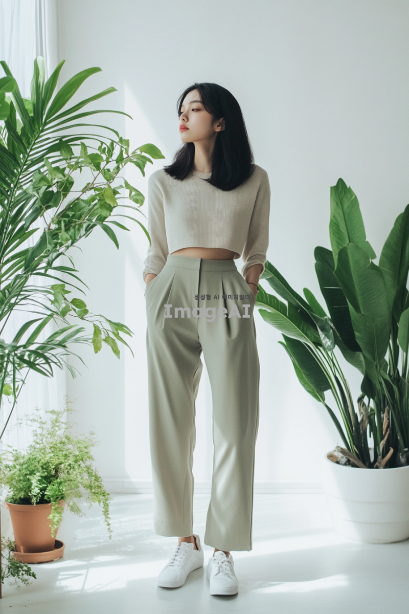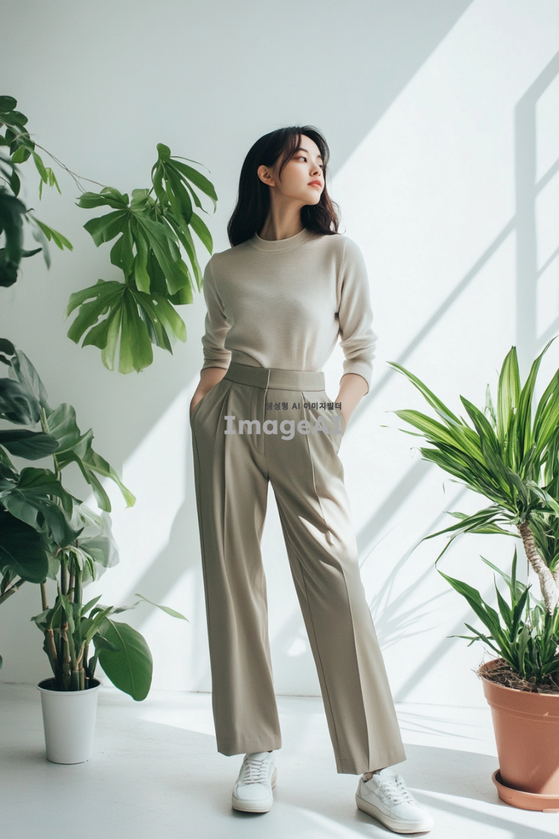 밴딩슬랙스를 입고 있는 한국인 여성, 얼굴은 보이지 않고 사진이 상체에서 잘린 모습, 배경은 화이트에 식물이 있는 실내, 식물 하나와 큰 액자 하나 말곤 어떤 소품도 없는 흰색 벽 배경, 개주얼한 스타일의 상의를 입고 있으며 흰색 운동화를 신고 있음.