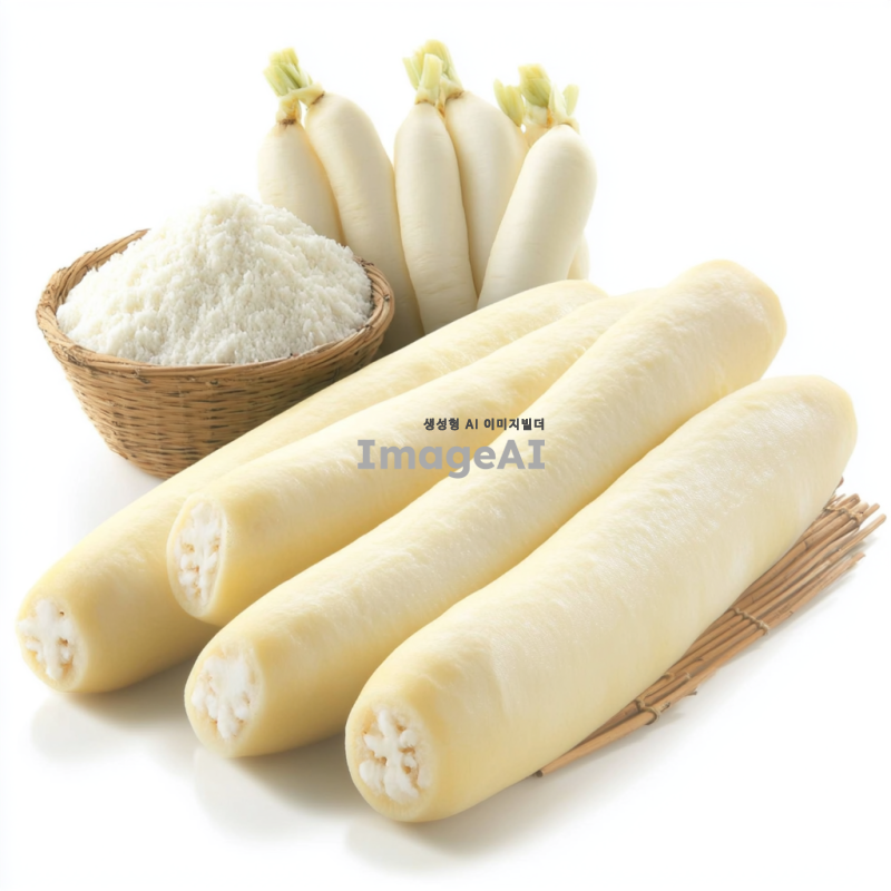 한국의 전통 무, 신선한 무의 세밀한 디테일, 자연광 속에서 촬영된 모습,