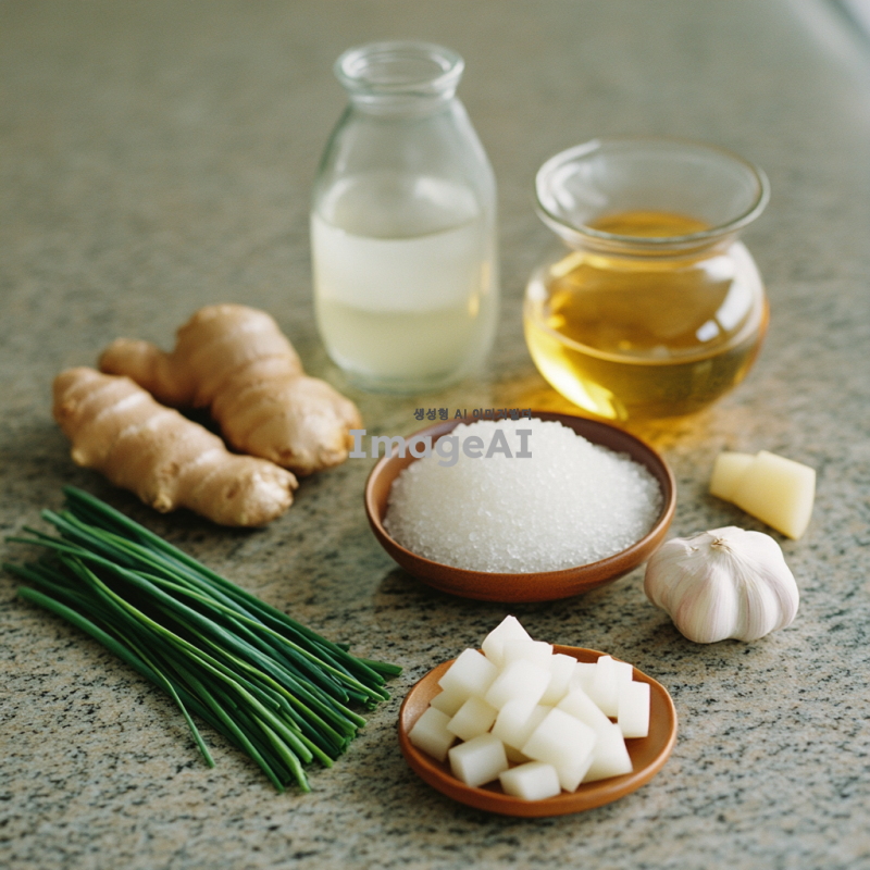 한국의 전통 주방, 조리대 위에 놓인 재료들: 무 1개, 굵은 소금 1/2컵, 물 2L, 설탕 1 큰 술 또는 알룰로스, 쪽파 또는 대파, 마늘 3쪽, 생강 1조각, 사이다 100ml. 이 재료들이 정갈하게 배열되어 있는 모습, 자연광이 비치는 따뜻한 분위기, 전통적인 한국식 주방의 느낌을 강조.
