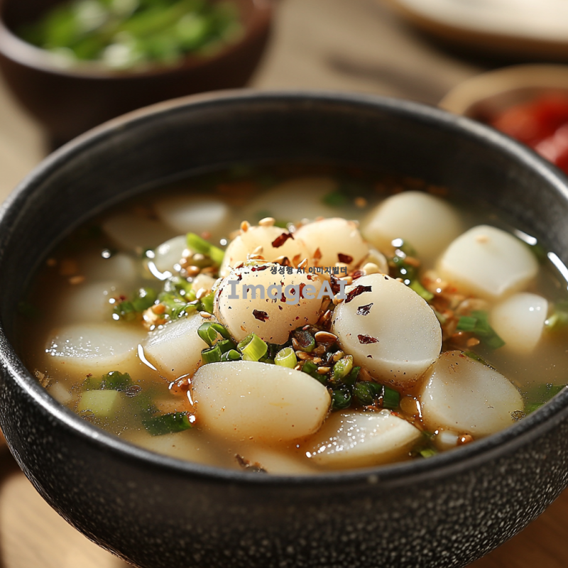 신선한 재료로 가득한 동치미 한 그릇, 투명한 국물에 아삭한 무, 마늘 조각이 담겨 있는 모습. 배경은 전통적인 한국의 식탁, 자연광이 비치는 따뜻한 분위기. 동치미의 시원한 느낌이 잘 드러나는 장면.