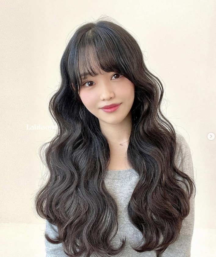 30대 후반의 한국의 평범한 여성, 긴 머리, 앞머리, 검은색, 느슨한 웨이브로 헤어 스타일링. 사진은 부드러운 베이지색 배경에서 그녀의 생기 있는 개성을 포착해야 함. 그녀는 밝은 표정을 지으며 어깨 주위로 떨어지는 두꺼운 웨이브 머리를 보여줌. 그녀의 메이크업은 자연스럽다.