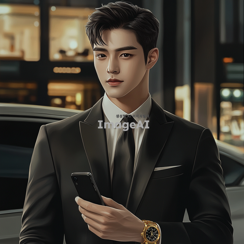 고급스러운 정장을 입고 있는 한국 남성 캐릭터, 세련된 헤어스타일과 자신감 넘치는 표정, 배경에는 고급 레스토랑이나 럭셔리 자동차가 보이는 풍경, 손에는 고급 시계나 스마트폰을 들고 있는 모습, 전체적으로 부유함과 품위를 강조하는 분위기.
