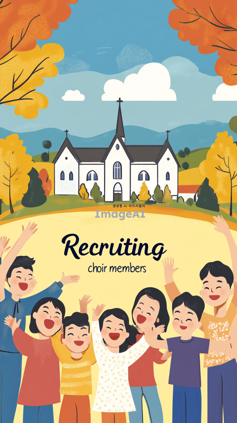 한국 교회 찬양대원 모집 광고 포스터. 다양한 연령대의 한국인들이 함께 즐겁게 찬양하는 모습, 아이들이 웃으며 손을 흔들고 어른들이 화답하며 노래하는 장면. 화사한 색감과 따뜻한 분위기로, 찬양의 기쁨과 화합을 강조한 이미지. 배경에는 교회와 자연이 어우러진 풍경, 포스터 중앙에는 "찬양대원 모집"이라는 문구가 돋보이도록 디자인.