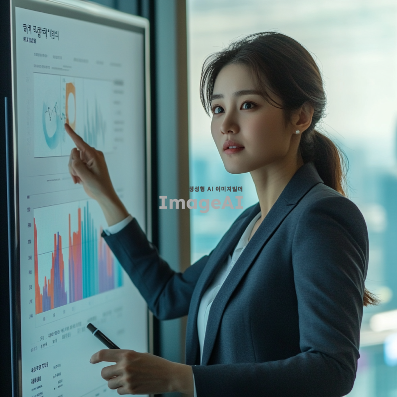 정장을 입고 그래프를 표시하고 있는 한국인 여성. 그녀는 회의실에 서 있으며, 그래프가 담긴 프레젠테이션 화면을 가리키고 있다. 배경은 현대적인 사무실 환경으로, 창문 너머로 도시 풍경이 보인다. 그녀의 표정은 자신감 넘치고 전문적이며, 손에는 마커를 쥐고 있다.