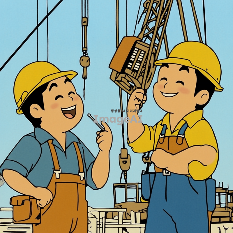 노가다 현장에서 일하는 한국인 남성 두명이 서로 이야기를 나누며 라디오를 듣고 있는 모습. 배경은 건설 현장으로, 햇빛이 비치는 밝은 날씨. 남성들은 작업복을 입고 있으며, 서로 웃으며 소통하고 있는 장면을 포착. 라디오에서 나오는 음악의 느낌이 전해질 수 있도록 즐거운 분위기를 강조. 일러스트 형식으로 제작