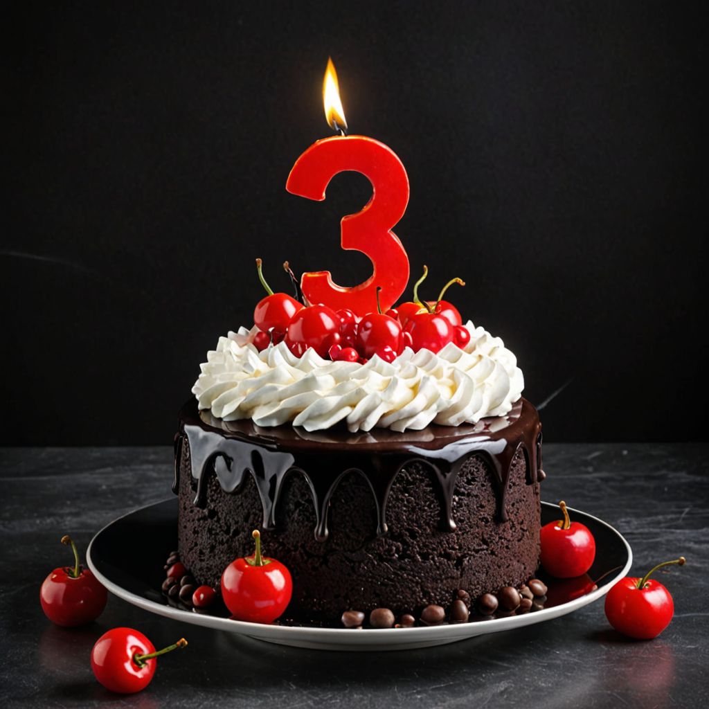 검은 배경 위에 놓인 검은색 케이크, 케이크 위에는 흰색 생크림으로 장식, 숫자 3이라는 불붙은 초가 배치되어 있는 모습. 케이크는 검은색 접시에 담겨 있으며, 전체적으로 심플하고 세련된 느낌을 주는 이미지.