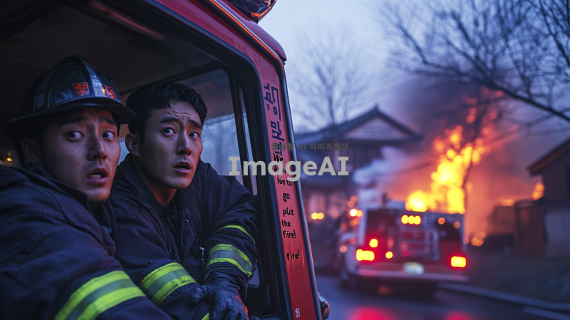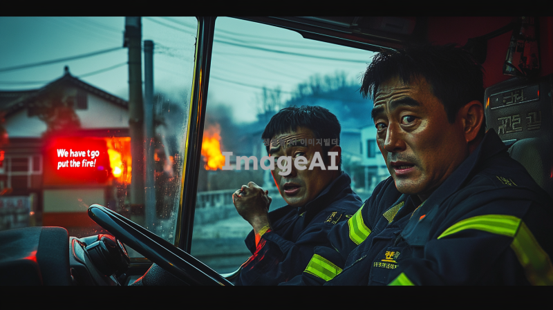 두 명의 한국인 소방수가 소방차에 탑승해 있는 모습. 운전석에 앉아 있는 소방수는 창밖으로 원수의 집이 불타는 장면을 바라보며 고민하는 표정을 짓고 있다. 옆에 앉은 동료 소방수는 그의 멱살을 잡고 절박한 표정으로 "불을 끄러 가야 해!"라고 소리치는 모습. 소방차는 긴급 상황을 반영하듯 경고등이 켜져 있고, 배경에는 타오르는 불꽃과 연기가 피어오르는 집이 보인다. 긴박한 상황 속에서의 갈등과 결단의 순간을 담아낸 장면.