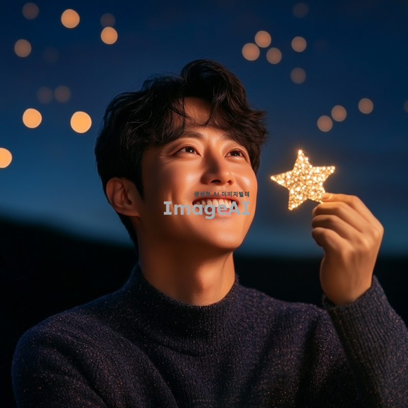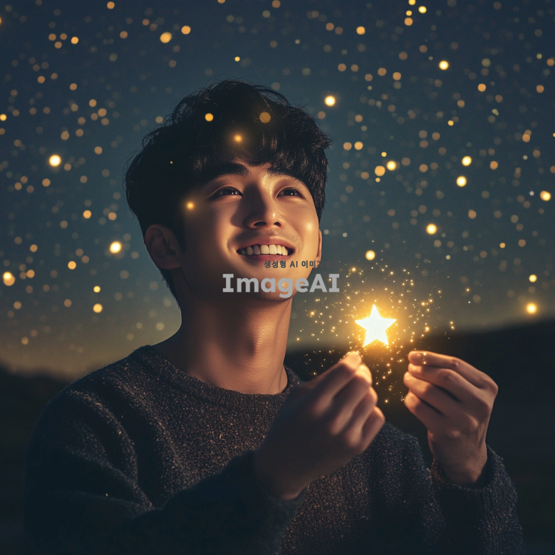 반짝이는 별들이 가득한 밤하늘 아래, 행복한 표정을 짓고 있는 한국인 남성이 손에 별을 쥐고 있는 모습. 따뜻한 미소와 함께 주변에 은은한 빛이 퍼져나가고, 별빛이 그의 얼굴을 환하게 비추고 있는 장면. 배경은 고요한 자연 풍경으로, 별들이 반짝이며 꿈꾸는 듯한 분위기를 자아내고 있는 이미지.