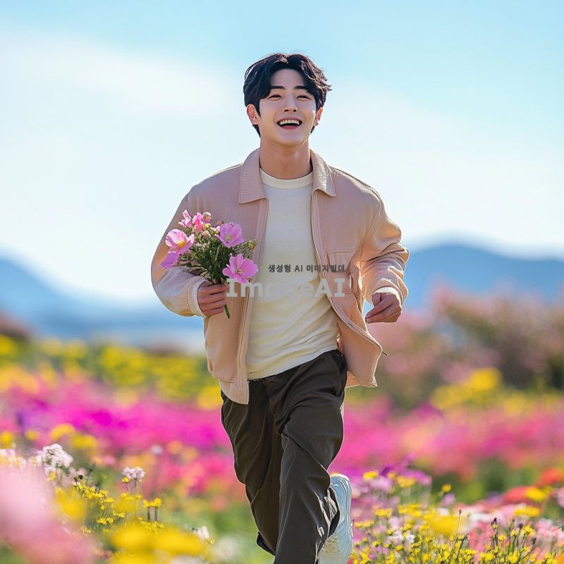 아름다운 꽃밭에서 사랑스러운 한국인 남성이 예쁜 꽃을 들고 달려가는 모습, 그의 표정은 설렘과 기대감으로 가득 차 있고, 배경은 화창한 날씨와 푸른 하늘, 다채로운 꽃들이 만개한 풍경, 로맨틱한 분위기.