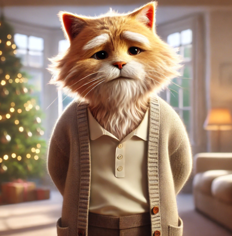 고양이 할아버지가 두 발로 서서 스웨터를 입고 있는 모습. 나이가 많아 보이며 힘이 없는 느낌을 주고, 의인화된 고양이의 특성을 살림. 배경은 넓은 거실로, 한쪽에는 크리스마스 트리가 있고, 벽난로가 있는 따뜻한 분위기. 3D 애니메이션 스타일로 표현된 장면.