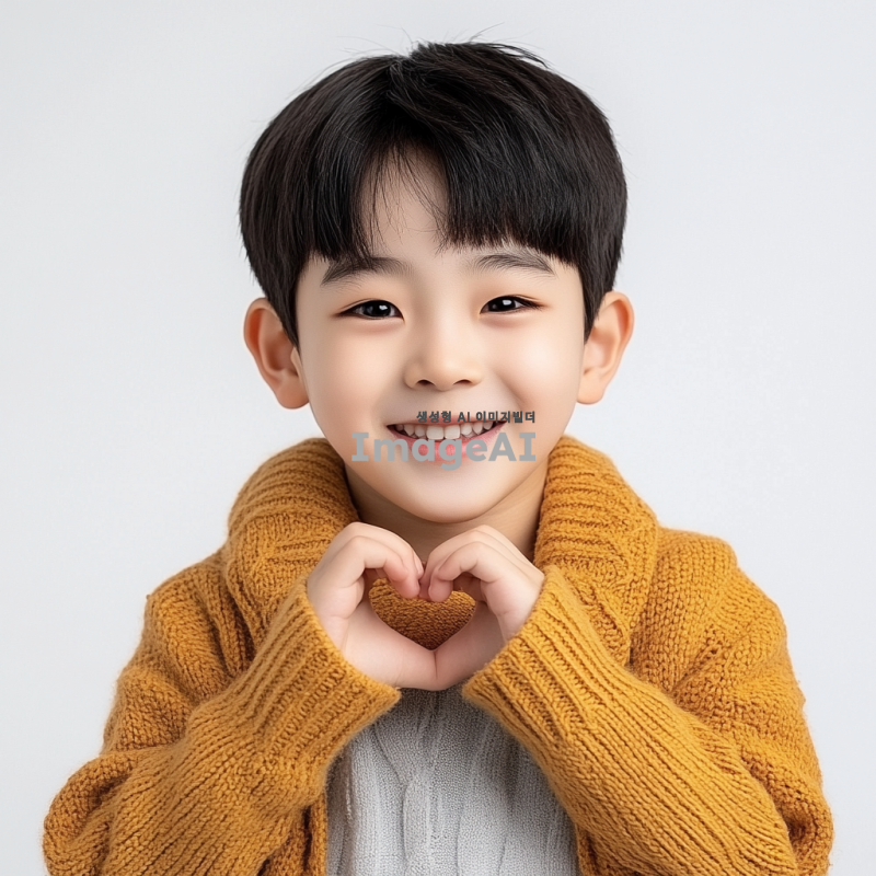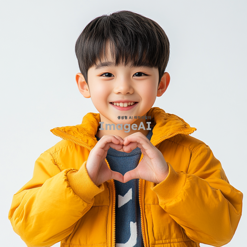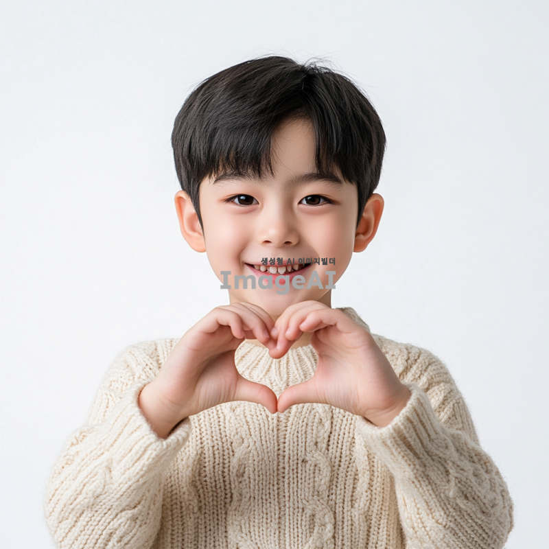 손하트를 만들고 있는 한국 소년의 모습. 소년은 밝은 표정을 지으며, 사랑스러운 느낌을 주는 의상을 입고 있다. 배경은 없이 소년만 강조된 이미지.