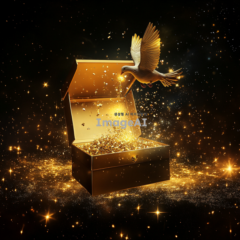 우주 공간에 떠 있는 거대한 선물 상자, 상자가 열리면서 황금 비둘기와 황금돼지가 등장하여 황금을 쏟아내는 장면. 별빛이 반짝이는 배경과 함께 신비로운 분위기를 강조하고, 선물 상자의 화려한 디자인과 황금빛의 생생함을 부각시켜 주세요.
