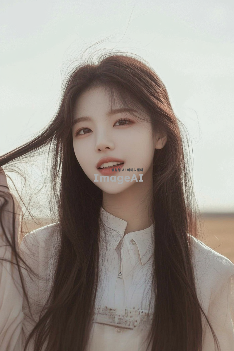 청순한 한국 여성, 긴 머리를 가지고 있으며, 서서 머리를 넘기는 모습, 자연스러운 표정과 부드러운 미소, 배경은 부드러운 자연 풍경, 따뜻한 햇살이 비치는 분위기.