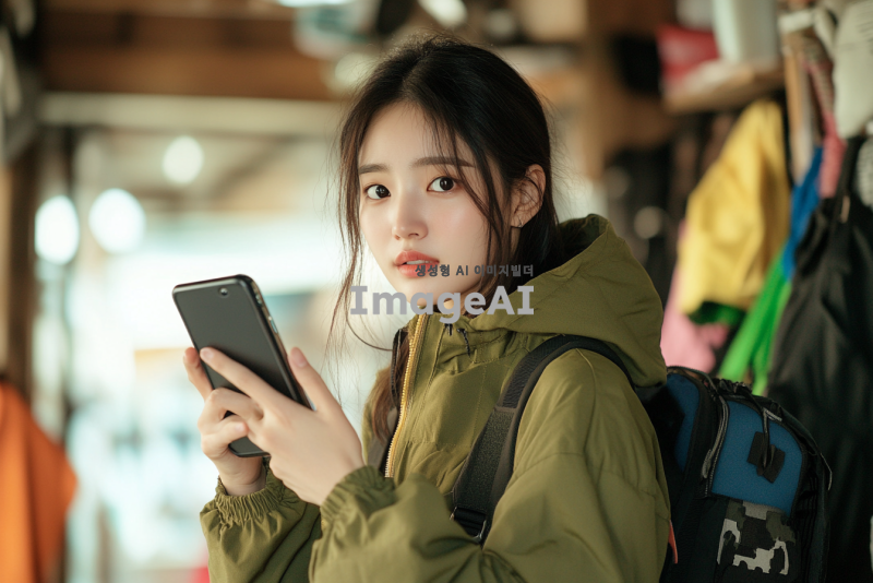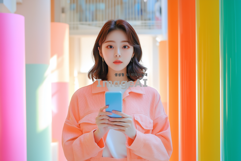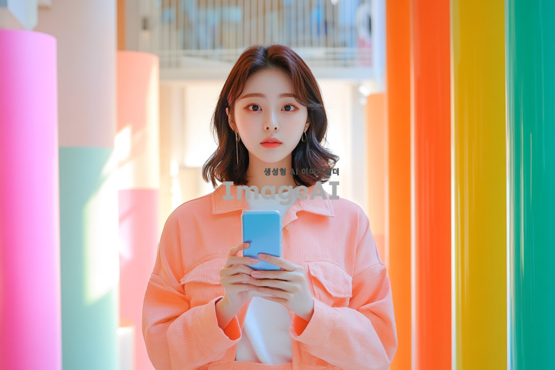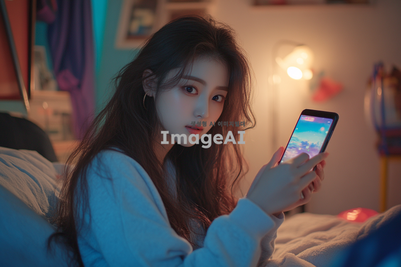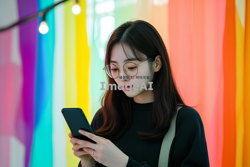 한 손에 핸드폰을 들고 집중해서 화면을 바라보는 한국 여성, 자연스러운 실내 배경, 부드러운 조명, 편안한 표정, 캐주얼한 복장, 현대적인 분위기, 다양한 색상의 소품들이 있는 공간.