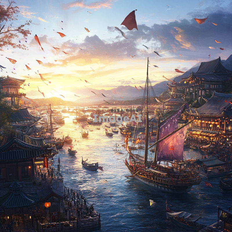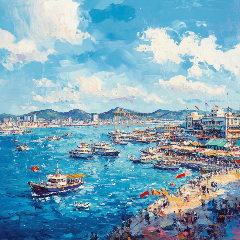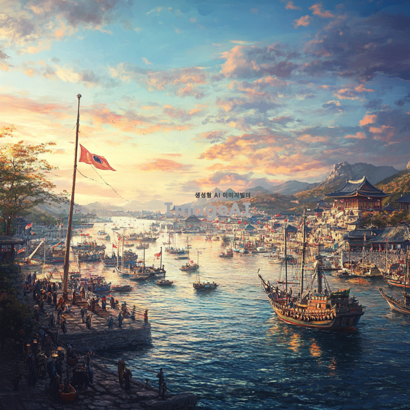 바람이 세차게 부는 항구의 풍경, 푸른 바다와 하늘, 배들이 떠 있는 모습, 항구의 구조물과 사람들, 바람에 휘날리는 깃발, 햇살이 비치는 따뜻한 분위기, 한국의 전통적인 요소가 가미된 항구의 모습, 자연과 도시가 어우러진 아름다운 장면