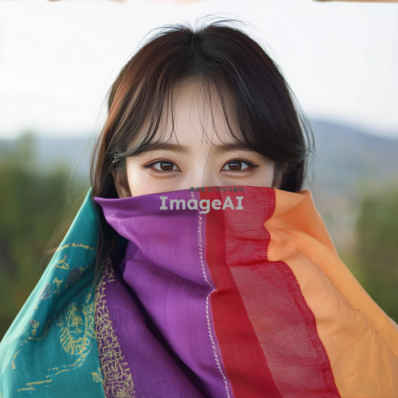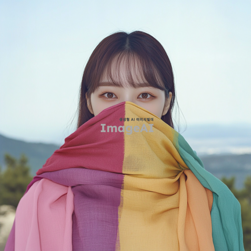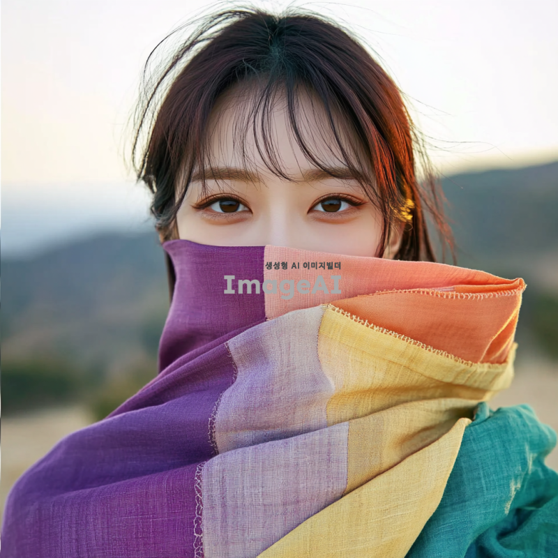 퍼스널 컬러 천을 얼굴에 두른 한국 여성, 부드러운 자연광 아래에서 고요한 표정을 짓고 있는 모습, 다양한 색상의 천이 얼굴을 감싸고 있는 장면, 배경은 흐릿한 자연 풍경으로 설정, 따뜻하고 편안한 분위기.