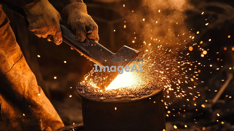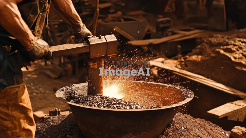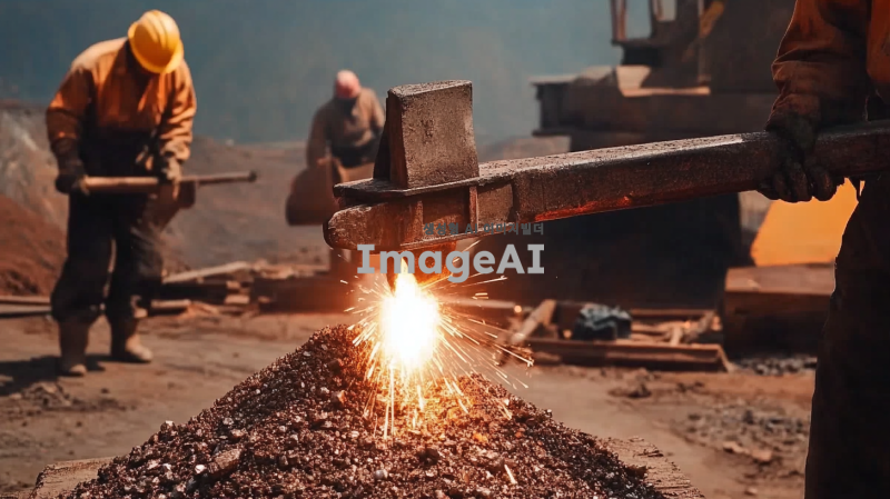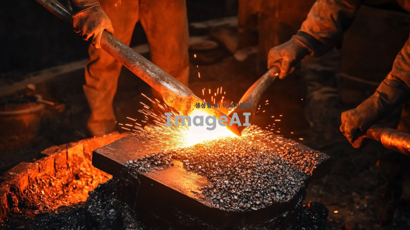 망치로 철강석을 두들기는 제련하는 모습