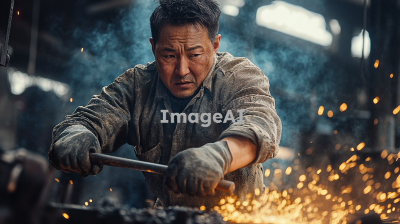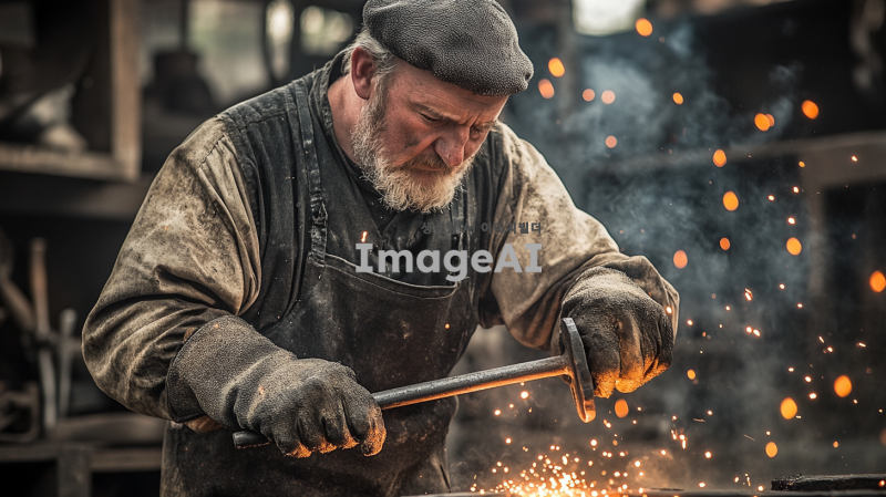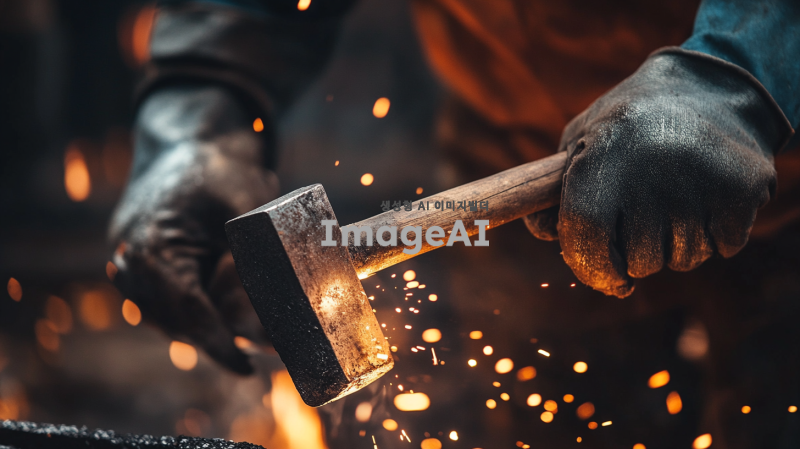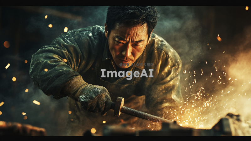 대장간에서 망치를 들고 철 덩어리를 내리치는 장면, 작업 장갑을 낀 한국인 제철공이 집중하며 작업하는 모습, 주변에는 불꽃과 연기가 일어나는 모습