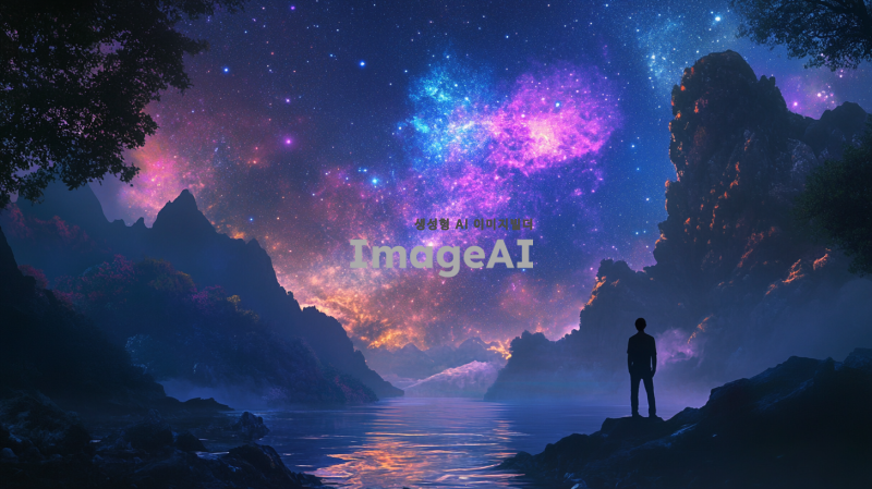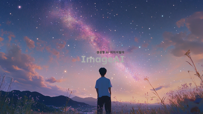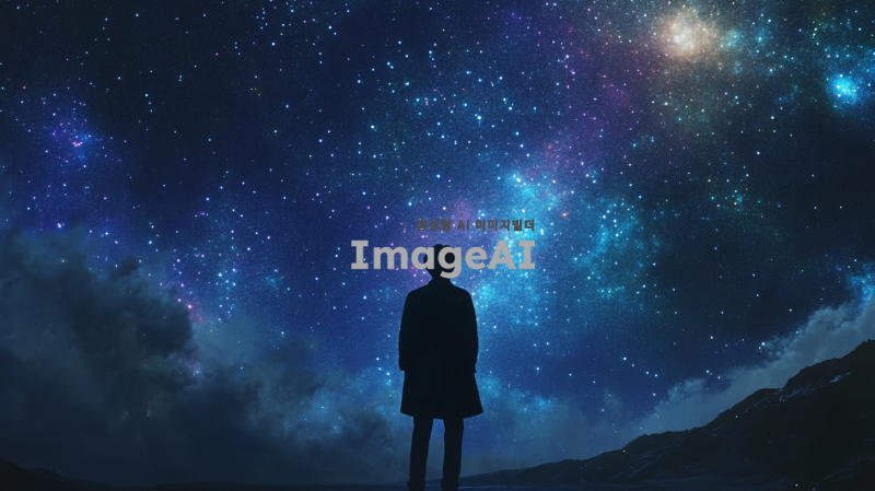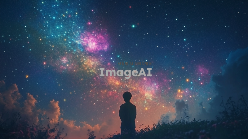 은하수를 배경으로 한 장면, 다양한 색상의 별들이 가득한 하늘, 몽환적이고 신비로운 분위기, 한국인 남성이 별을 바라보며 서 있는 모습, 부드러운 조명과 환상적인 색감이 어우러진 풍경, 꿈같은 느낌의 자연 경관.