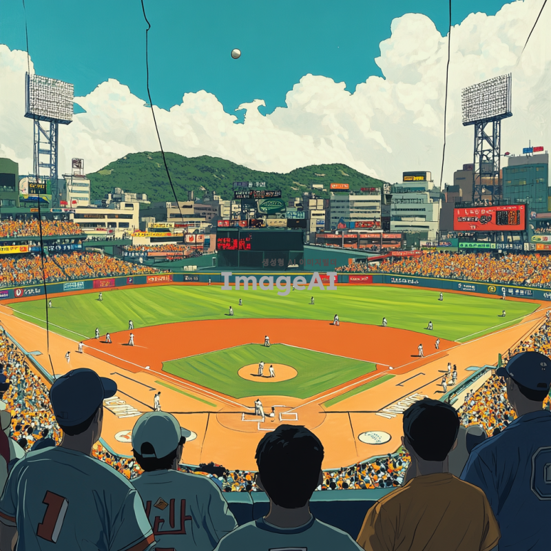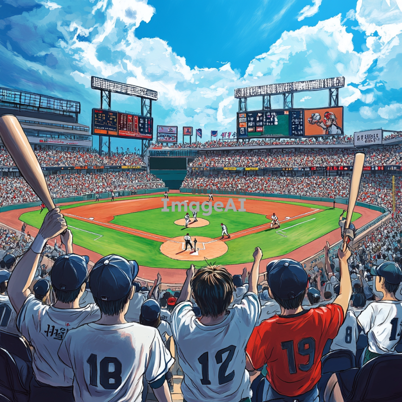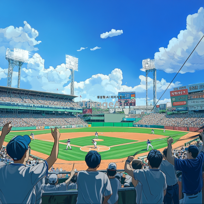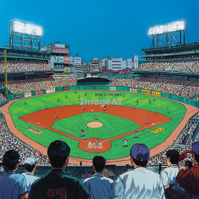 한국 프로야구 운동장에서 선수들이 경기를 하는 장면을 일본 애니메이션 스타일로 그려주세요. 선수들은 다양한 포지션에서 활발하게 움직이고 있으며, 관중석에는 열정적인 팬들이 응원하는 모습이 담겨 있습니다. 배경에는 한국의 야구장 특징이 잘 드러나도록 해주세요. 선수들의 유니폼은 한국 프로야구 팀의 전통적인 디자인을 반영하고, 애니메이션 특유의 생동감과 색감을 강조하여 활기찬 분위기를 연출해주세요.