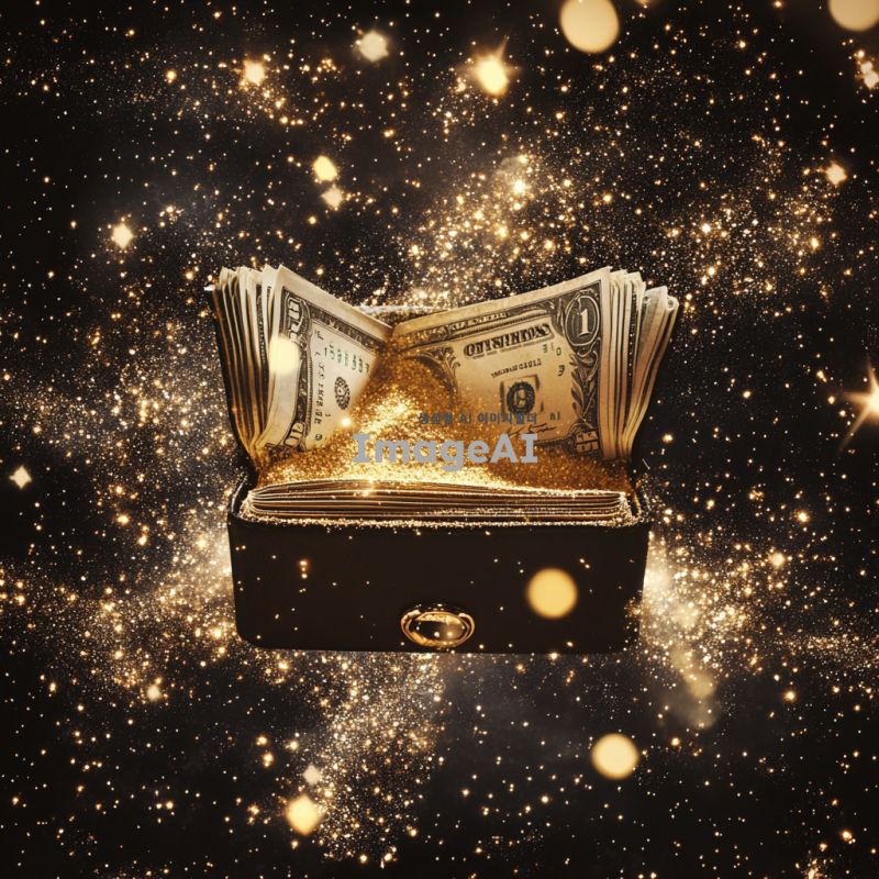 우주를 배경으로 한 이미지, 가운데에는 지갑이 열려 있고 현금으로 가득 차 있다. 지갑 주위에는 황금 가루가 흩어져 있으며, 반짝이는 별들이 배경을 수놓고 있다. 화려하고 신비로운 우주의 느낌을 강조하여, 꿈꾸는 듯한 분위기를 연출한다.
