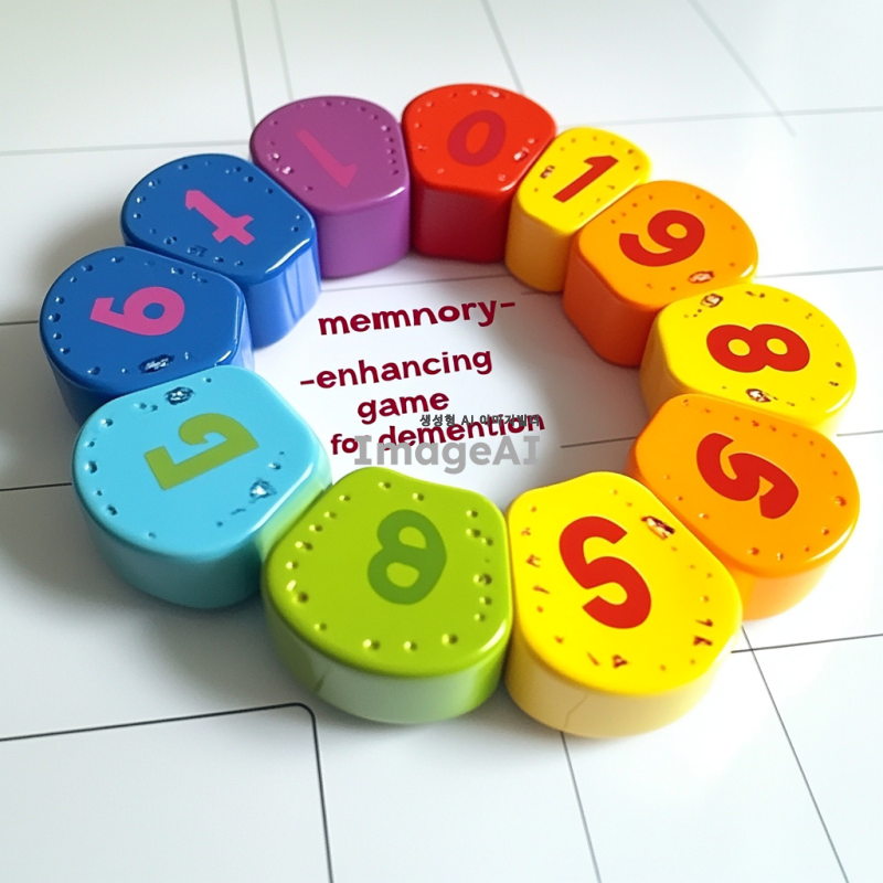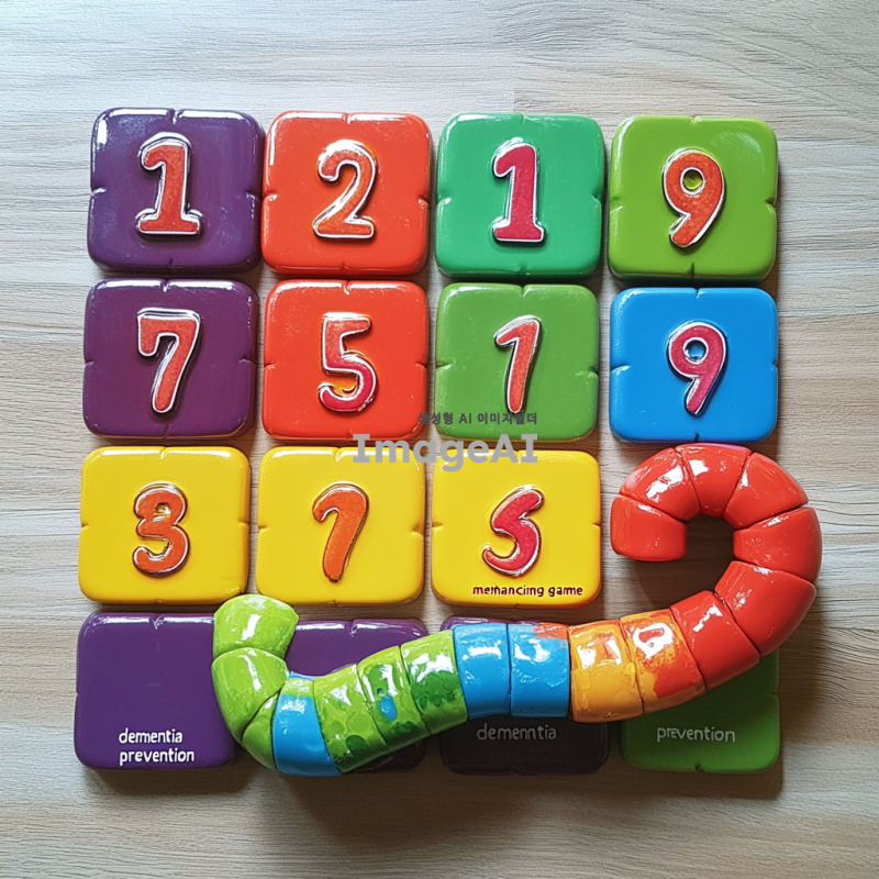 숫자뱀(9개의 숫자가 적혀있는 원형 블록이 하나의 줄로 연결되어있어 아이들의 숫자 놀이 도구로 활용되는 수단)을 활용하는 방안 중 하나로 ‘치매 예방을 위한 기억력강화 놀이’로해서 3*3 칸에 숫자 넣어서 몇초 보여주고 만들어보세요 제시하는 느낌의 영상