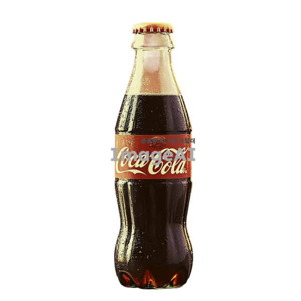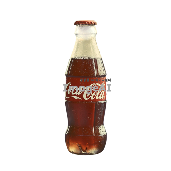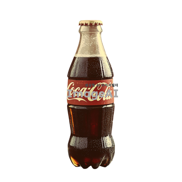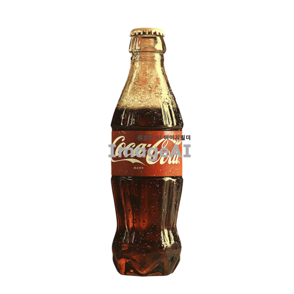 낡은 느낌의 유리병에 담긴 최초의 콜라 음료, 코카콜라 로고가 선명하게 보이는 모습. 배경은 빈티지 스타일로 꾸며져 있으며, 따뜻한 색조로 아날로그 감성을 강조한 이미지.