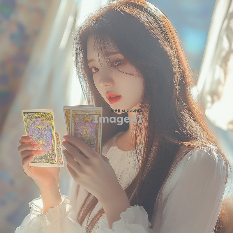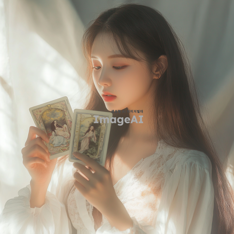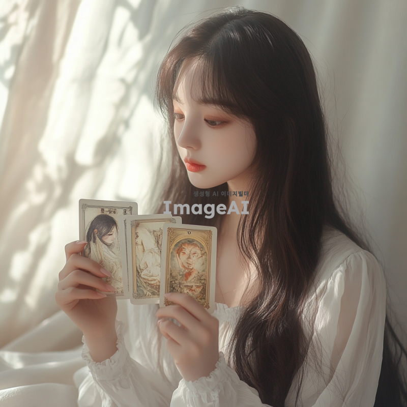 귀엽고 청순한 20대 초반 한국 여성, 타로카드 세 장을 들고 오른쪽 아래로 시선을 두고 있는 모습. 흰색 블라우스를 입고 긴 생머리를 가진 예쁜 얼굴. 배경은 부드러운 파스텔 톤으로, 아늑하고 신비로운 분위기를 연출.