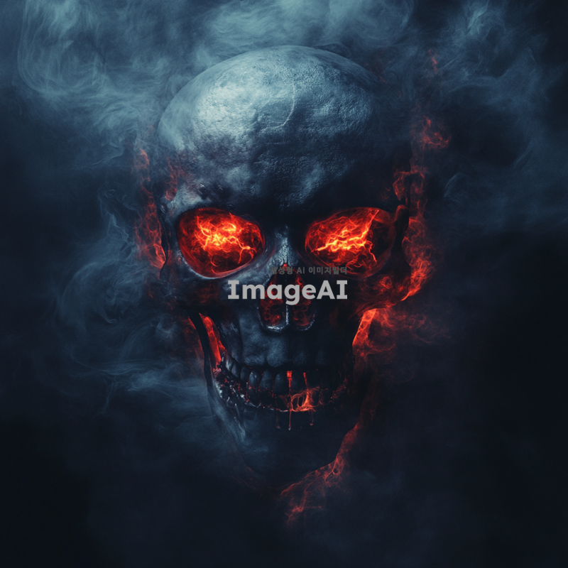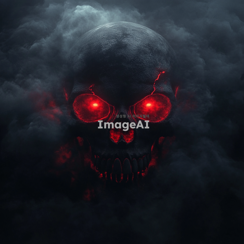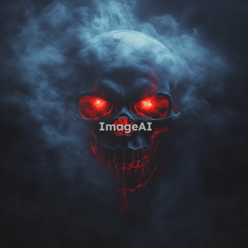 어두운 배경 속에서 붉은 빛을 발하는 눈을 가진 해골이 중앙에 위치하고 있으며, 그 주위를 감싸고 있는 신비로운 안개가 흐르고 있는 이미지. 해골의 표정은 위협적이며, 붉은 눈빛은 강렬하고 신비로운 느낌을 주고 있다. 전체적으로 음산하고 긴장감 있는 분위기를 연출하며, 어둠 속에서 빛나는 해골의 모습이 강조된다.