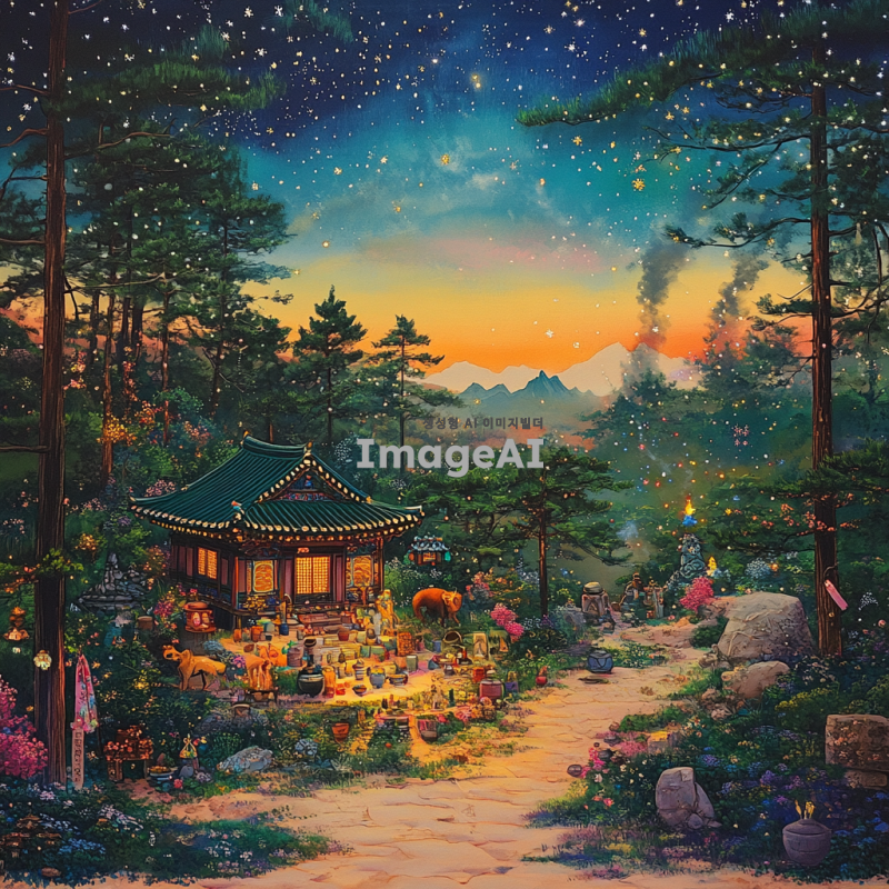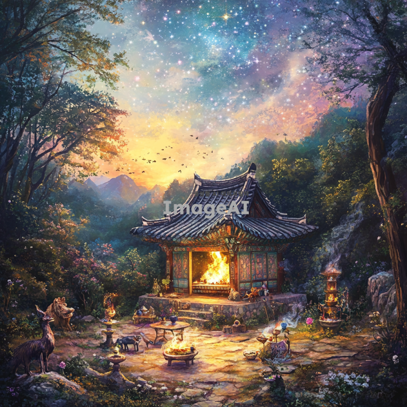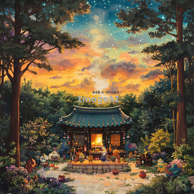 한국의 전통 무속 신앙을 배경으로 한 신비로운 풍경. 고요한 숲속에 자리 잡은 작은 무당의 집, 그 앞에는 다채로운 색상의 제기와 향이 피어오르는 제단이 놓여있고, 주변에는 신비로운 동물들이 어우러져 있는 모습. 하늘은 아름다운 노을로 물들어 있고, 나무 사이로 반짝이는 별들이 보인다. 이 모든 요소들이 조화를 이루며 신비로운 분위기를 자아내는 장면.