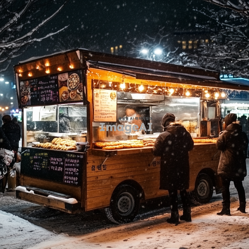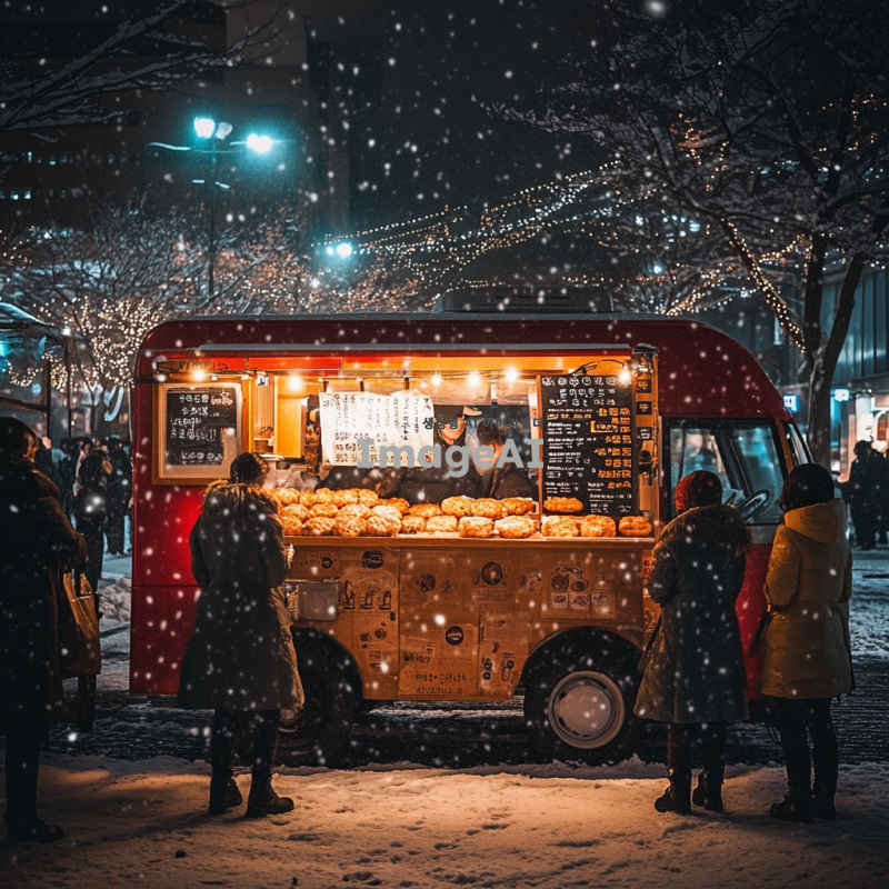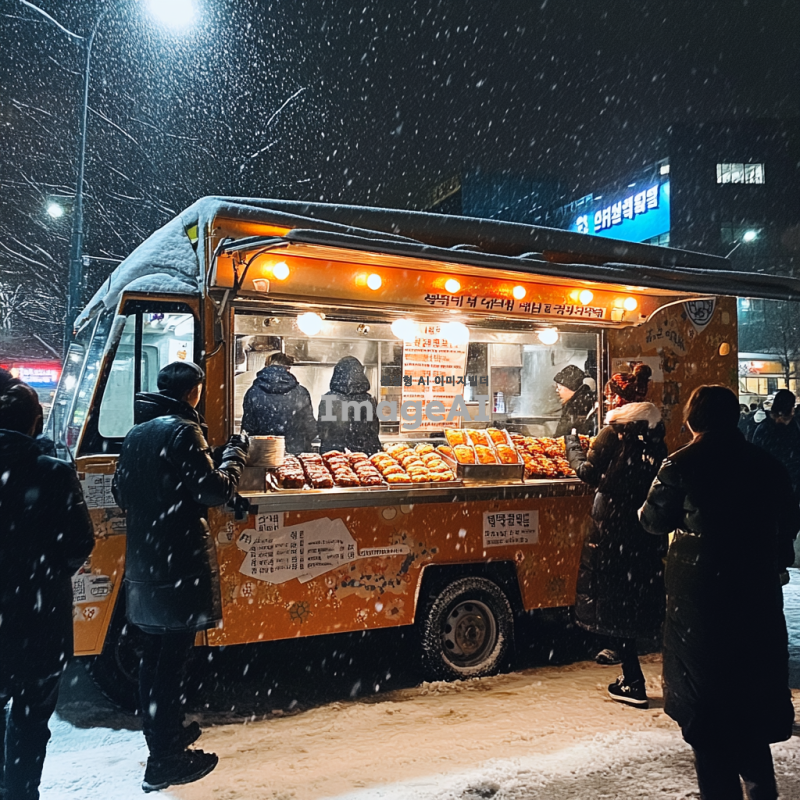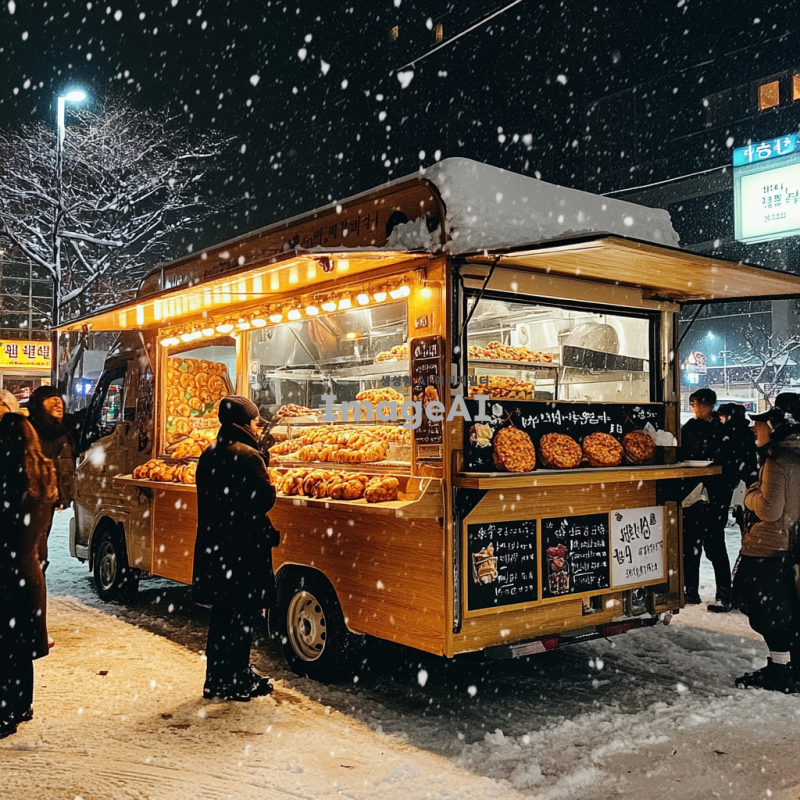 한국의 거리에서 호떡을 판매하는 푸드트럭, 아기자기한 디자인의 트럭, 다양한 종류의 호떡이 진열되어 있는 모습, 따뜻한 조명 아래 사람들이 줄 서서 기다리는 장면, 겨울밤의 따뜻한 분위기, 푸드트럭 주변에 눈이 쌓인 풍경, 한국 전통 간식의 매력을 강조한 이미지
