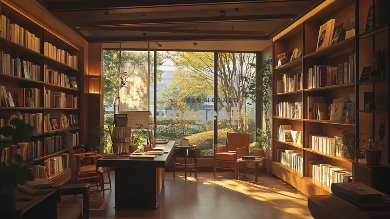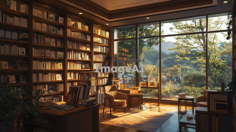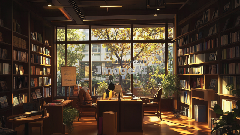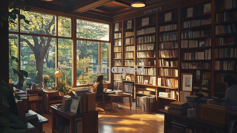 한국의 아늑한 서점 내부, 다양한 책들이 선반에 가득 진열되어 있고, 따뜻한 조명이 비추는 공간, 편안한 의자와 작은 테이블이 놓여 있으며, 창 밖으로는 나무가 우거진 풍경이 보이는 모습, 사람들이 책을 읽거나 대화하는 장면, 아기자기한 소품들이 배치되어 있는 따뜻한 분위기.