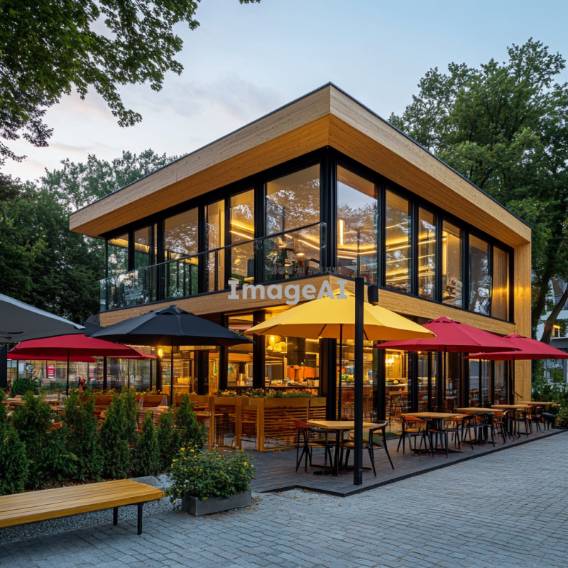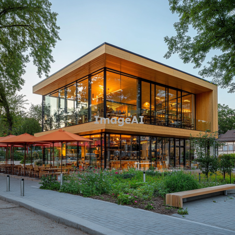 구청 앞 광장에 위치한 현대적이고 친근한 디자인의 카페. 목재와 유리 소재를 사용한 외관, 큰 유리창과 야외 테라스에 다양한 색상의 파라솔이 설치되어 있는 모습. 주변에는 푸른 녹지 공간과 벤치가 배치되어 있으며, 따뜻한 색감의 조명과 편안한 좌석들이 어우러져 아늑한 분위기를 자아내고 있는 장면.