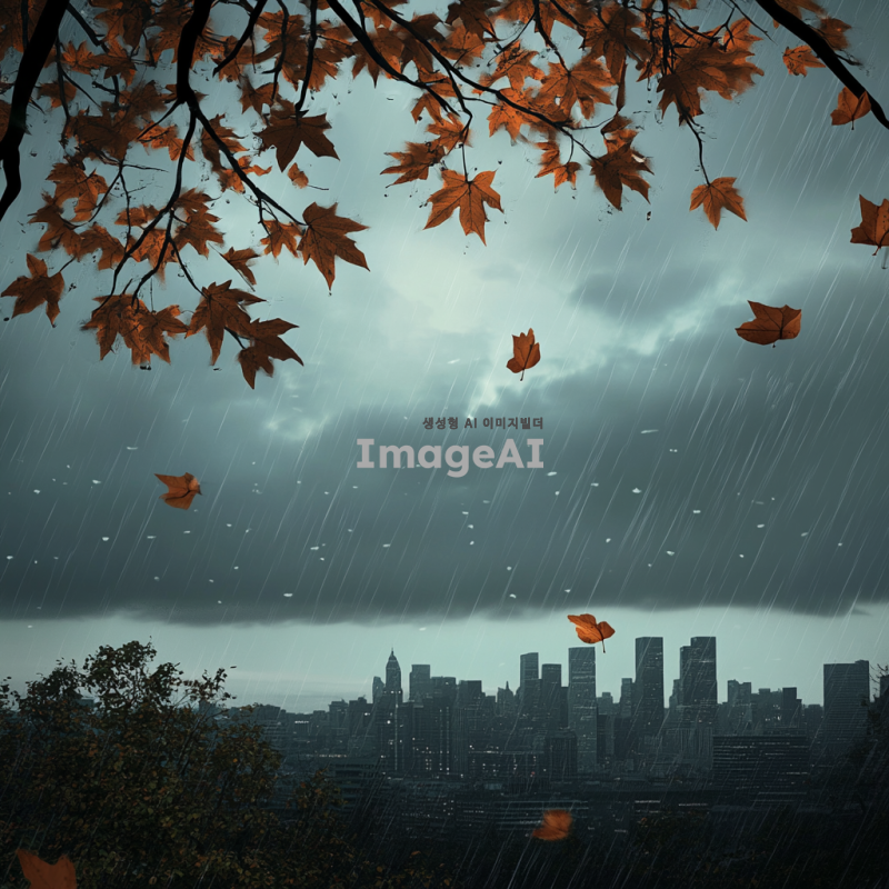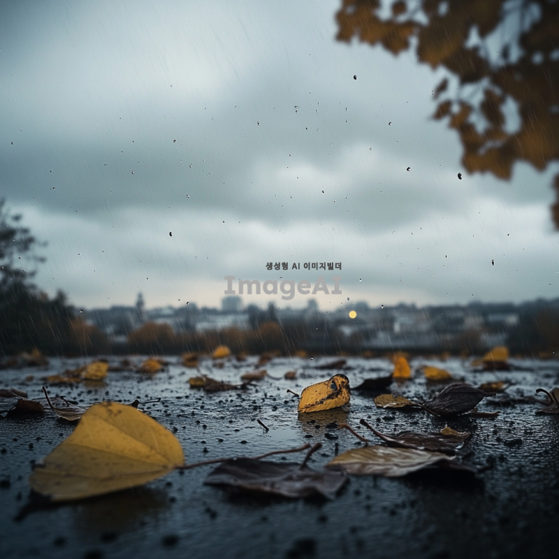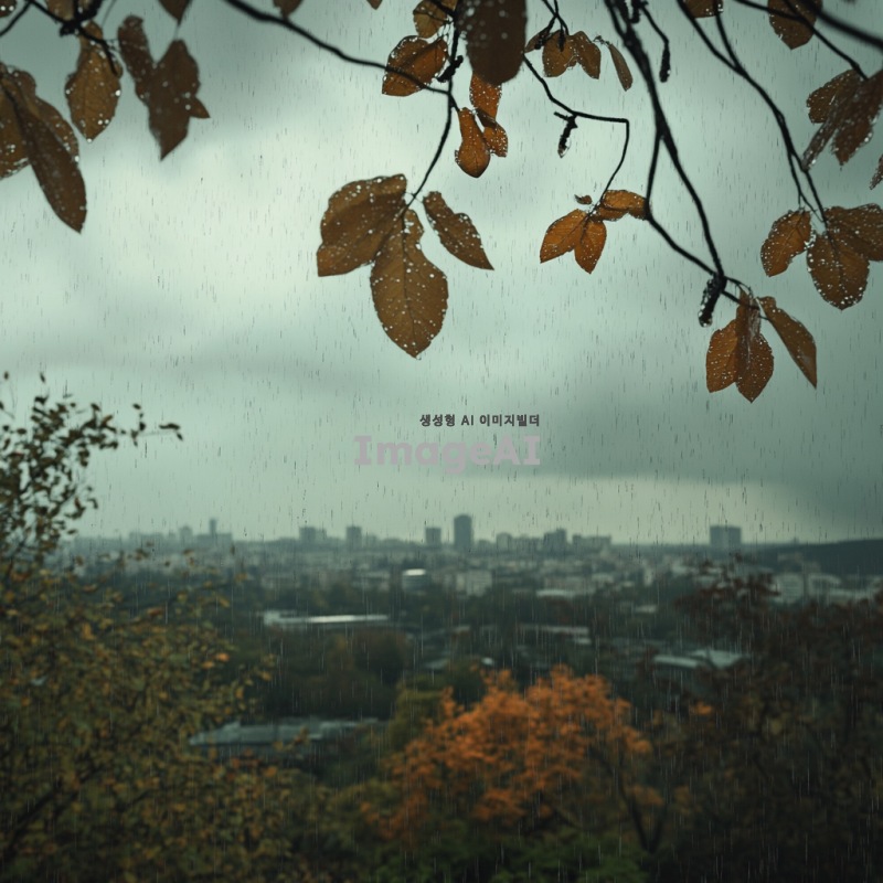 비가 내리는 하늘을 배경으로 한 풍경, 구름이 짙고 회색으로 가득 차 있으며, 빗방울이 떨어지는 모습이 보인다. 멀리 흐릿하게 보이는 도시의 실루엣과 함께, 물방울이 떨어지는 나뭇잎과 젖은 땅의 질감이 강조된 모습. 차분하고 우울한 분위기를 연출하며, 자연의 아름다움과 평화로움을 느낄 수 있는 장면.