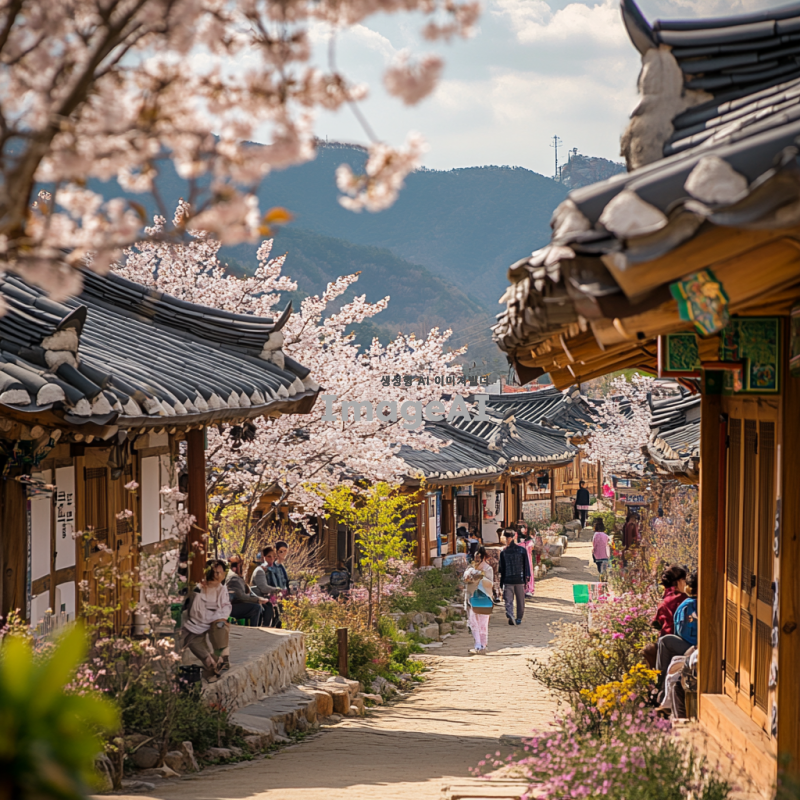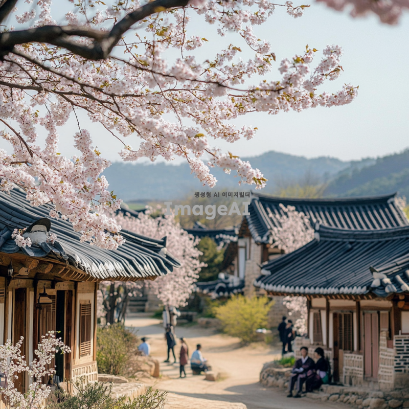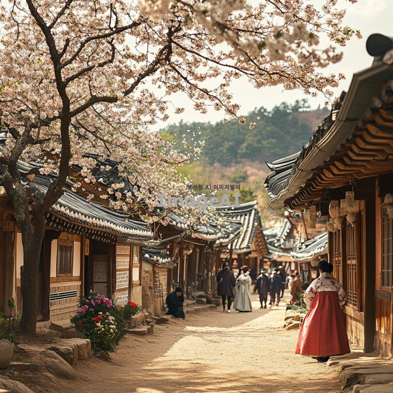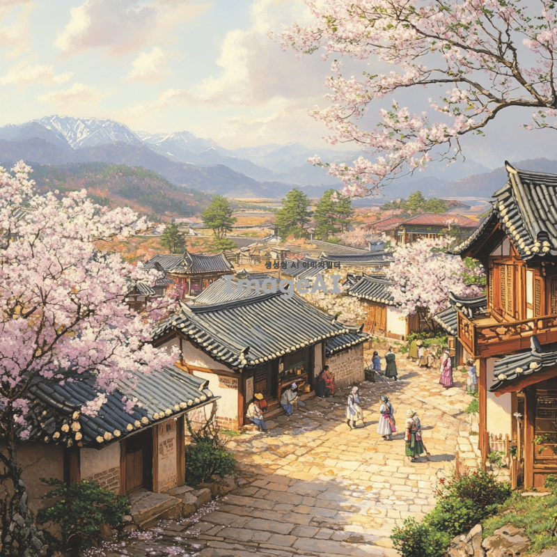한국의 전통적인 마을 풍경, 고즈넉한 한옥과 아름다운 자연이 어우러진 모습, 따뜻한 햇살 아래에서 사람들이 여유롭게 지내는 장면, 벚꽃이 만개한 봄날의 분위기, 전통 의상을 입은 사람들, 평화롭고 아늑한 느낌, 세밀한 디테일과 생동감 넘치는 색감.