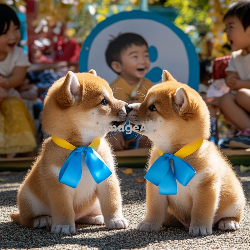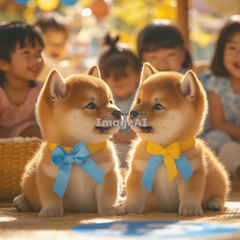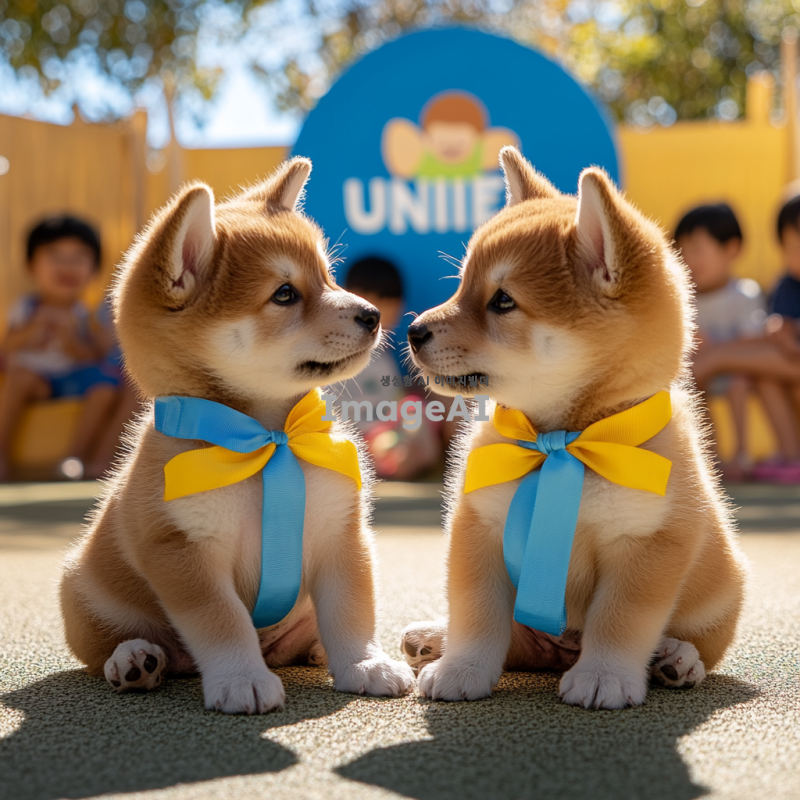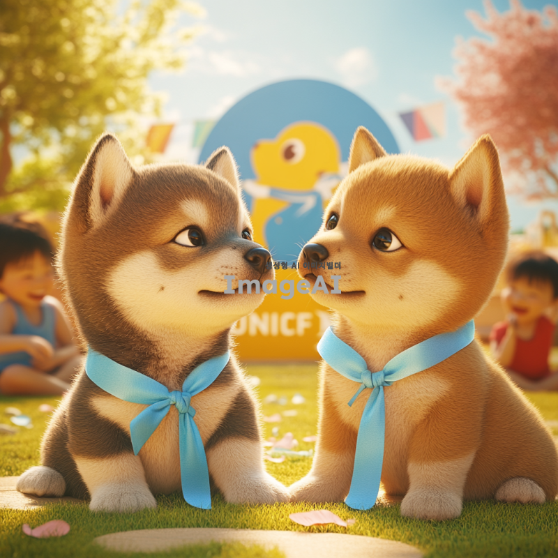 시바이누 강아지 두 마리가 유니세프 로고 앞에서 서로를 바라보며 귀엽게 앉아 있는 모습. 강아지들은 각각 파란색과 노란색 리본을 매고 있으며, 배경은 따뜻한 햇살이 비추는 공원으로, 주변에는 다양한 어린이들이 웃고 뛰어놀고 있는 모습이 보인다. 강아지들의 눈빛은 사랑스럽고 친근하며, 후원에 대한 메시지를 전하는 듯한 느낌을 주는 이미지.
