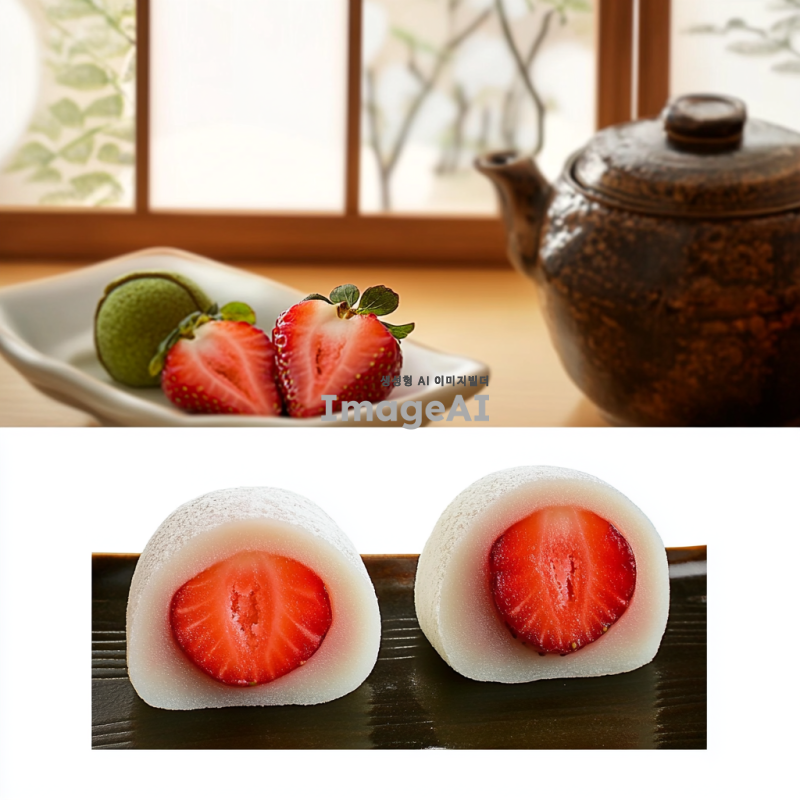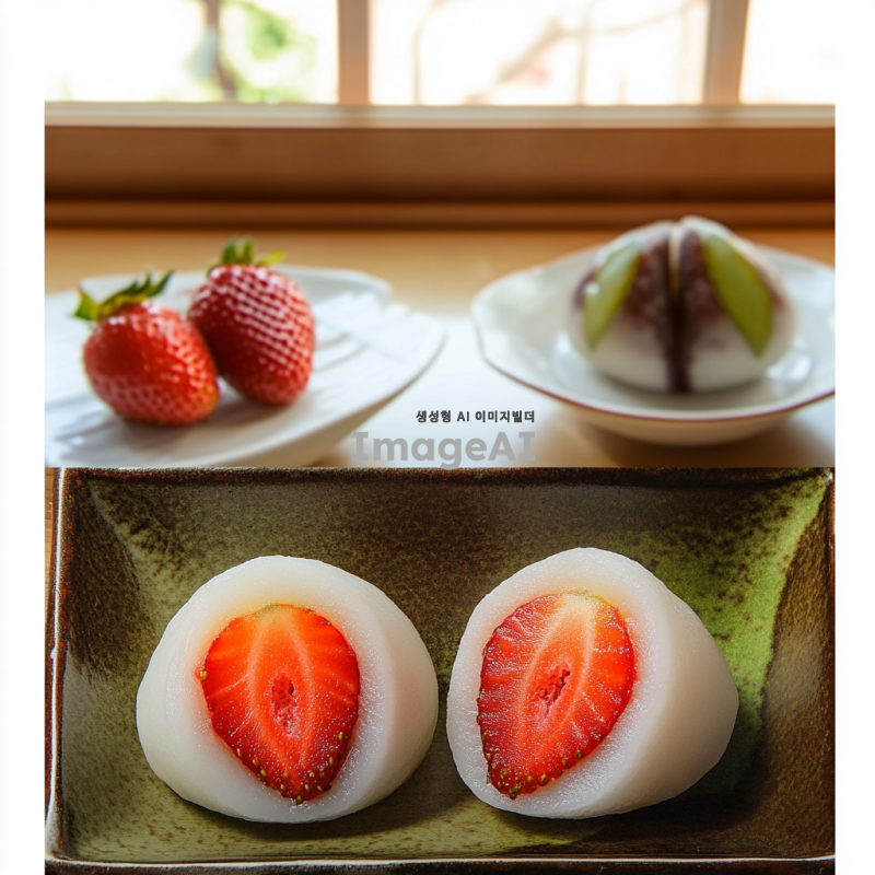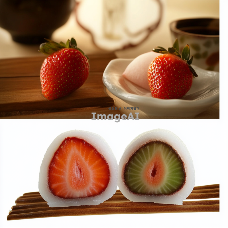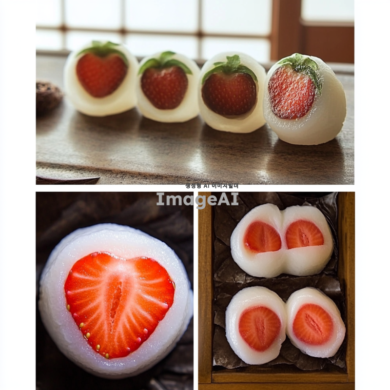 부드러운 흰색 떡 안에 신선한 딸기가 들어있는 딸기모찌, 상큼한 딸기의 붉은색과 떡의 부드러운 질감이 잘 어우러진 모습, 배경은 아기자기한 일본 전통 차실, 조명이 따뜻하고 아늑한 분위기, 디테일한 식감과 색감 표현.