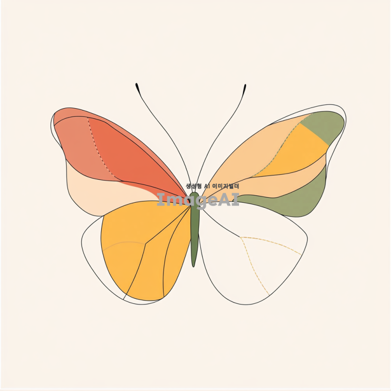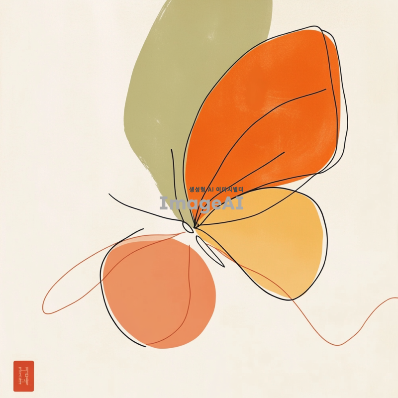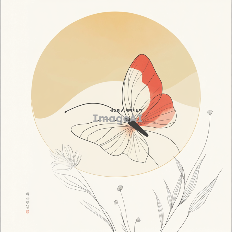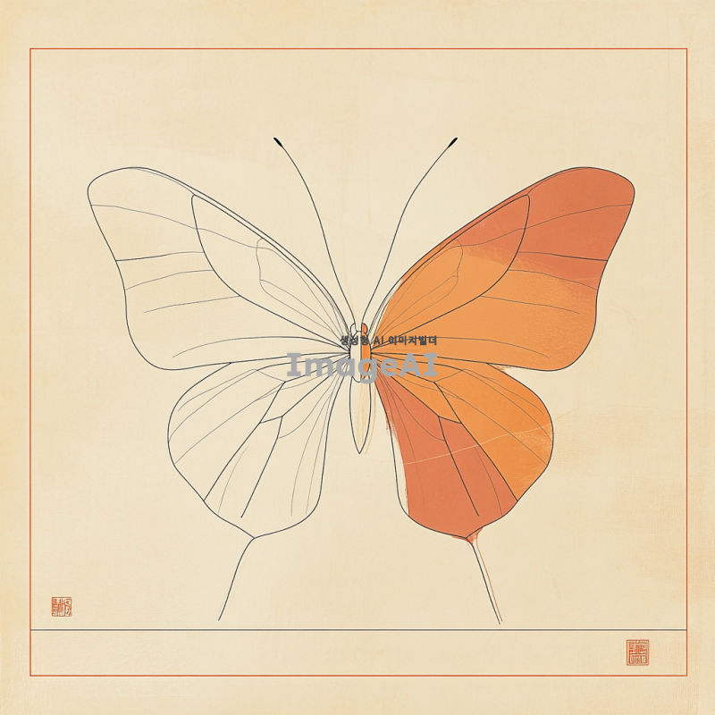 사과 반쪽을 연상시키는 심플한 나비 모양의 라인 아트, 부드러운 곡선과 세련된 디자인, 자연을 배경으로 한 조화로운 색상 조합, 한국적인 감성을 담은 아트워크.