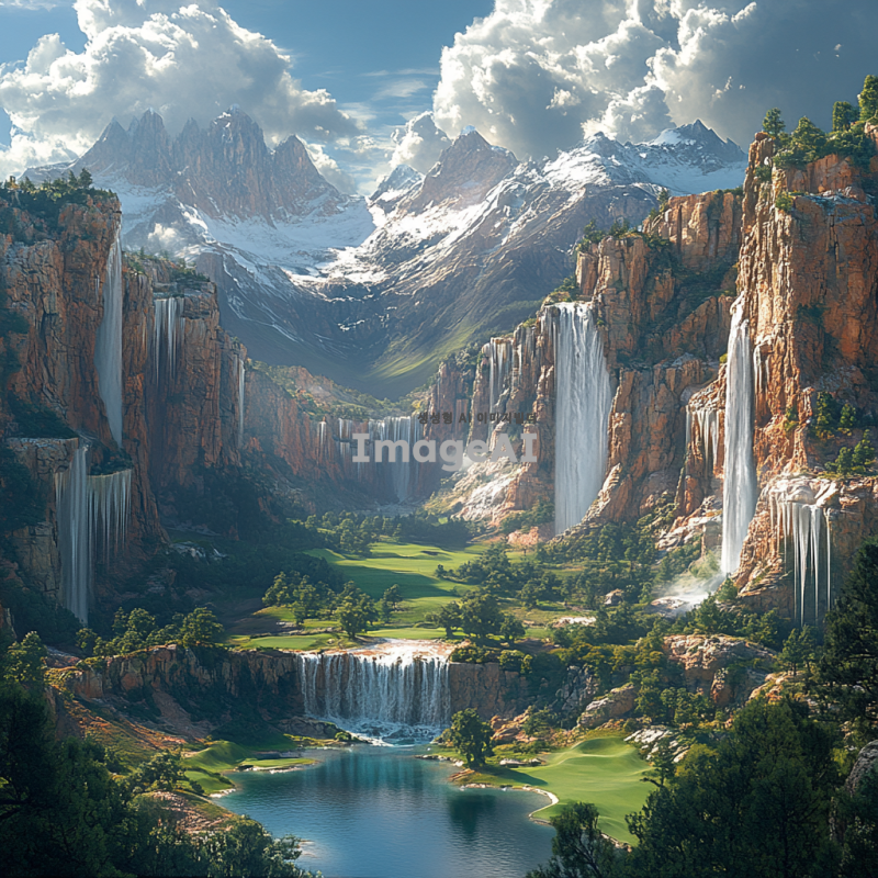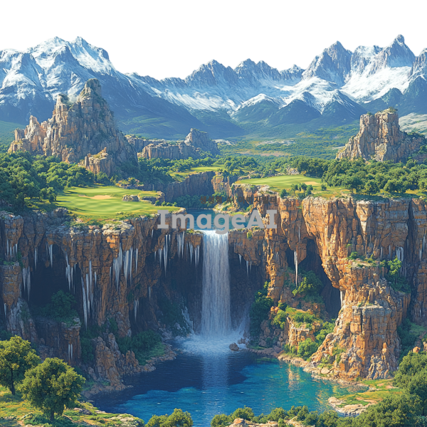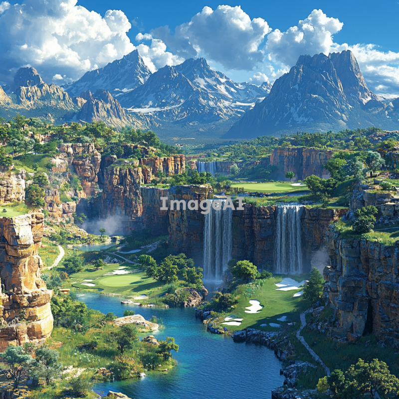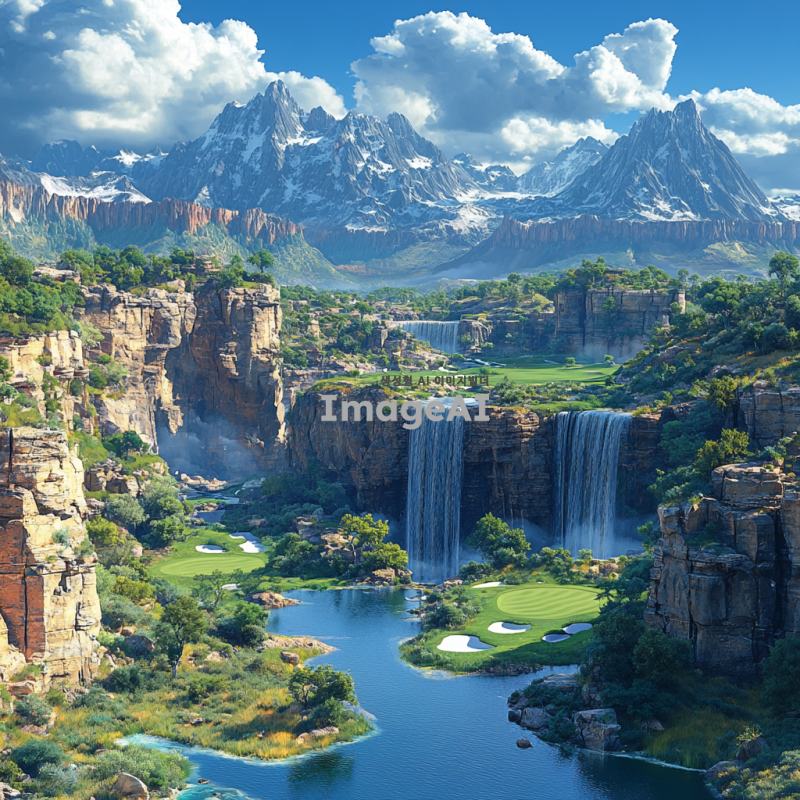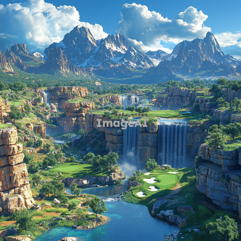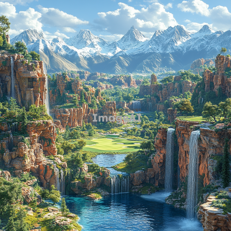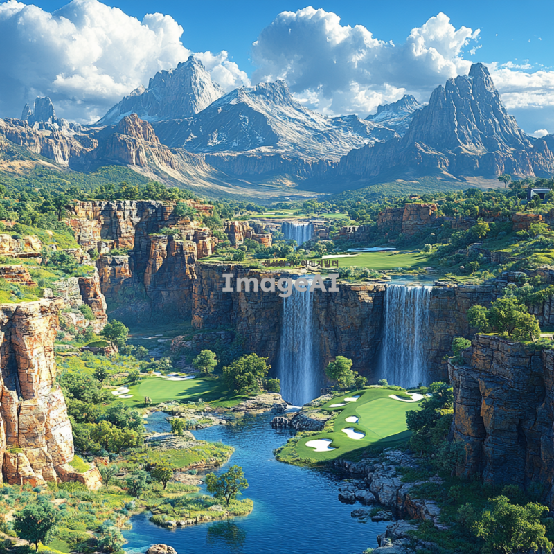 걸작, 최고 품질,초고화질, 세밀한 세부사항, 8k, 풍경 ,판타지, 광활한, 절벽 , 절경 , 골프장이 있다, 호수, 위에서 떨어지는 폭포, 지형 사이사이 절벽 및 수직구멍, 거꾸로 매달린 고드름처럼생긴지형, 에서 그랜드 캐니언처럼 생긴 산, 뒷배경은 넓은 로키산맥, 좌측배경과 우측배경 느낌다름