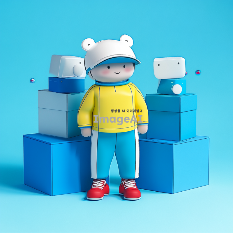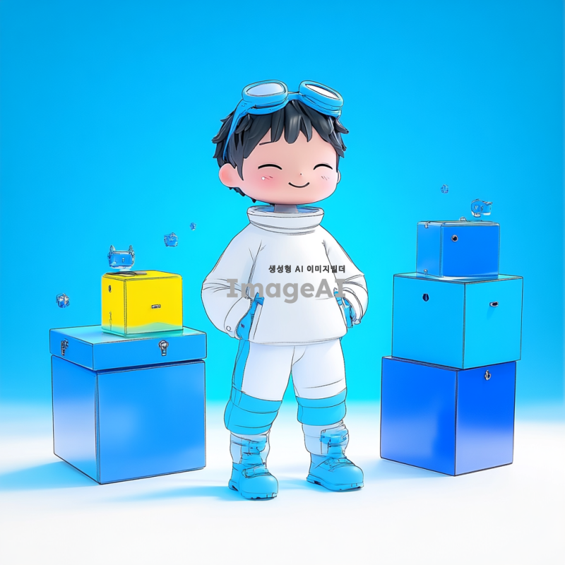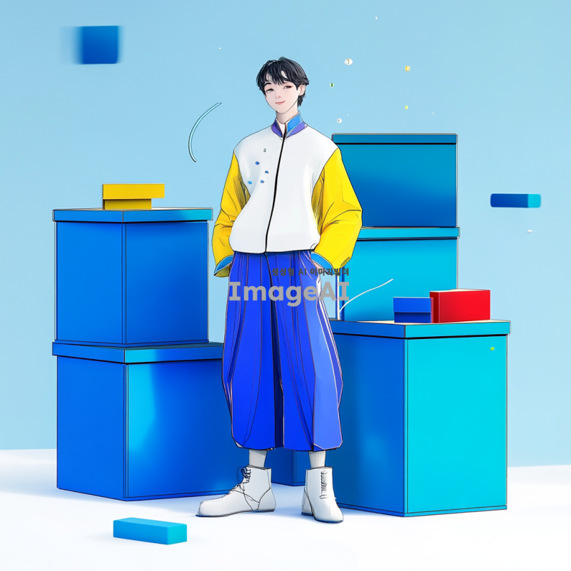 한국인 캐릭터가 파란색 배경 앞에 서 있는 모습, 캐릭터는 밝고 즐거운 표정을 짓고 있으며, 주변에는 다양한 파란색 톤의 요소들이 어우러져 있는 장면. 캐릭터의 의상은 현대적이고 세련된 스타일로, 배경의 파란색과 조화를 이루는 디자인.