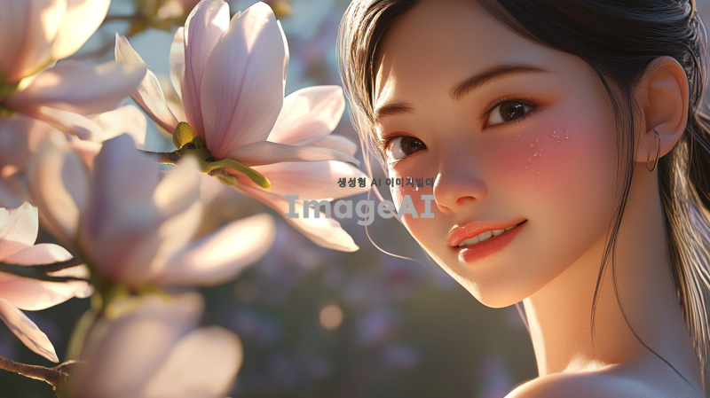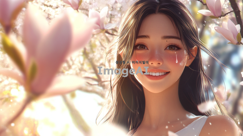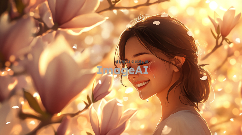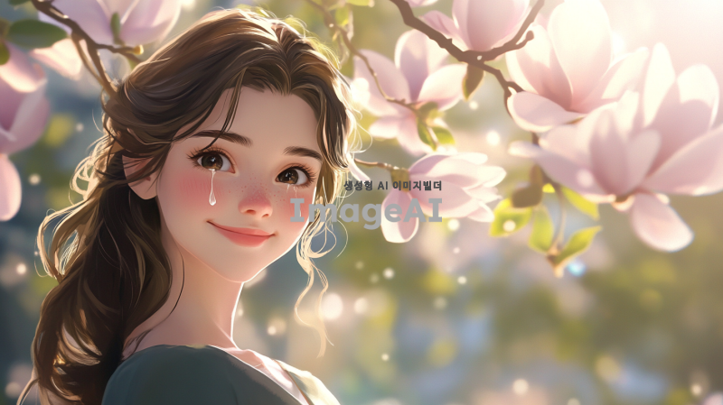 그녀의 웃는 모습이 활짝 핀 목련꽃처럼 아름답고 따뜻한 봄날의 풍경 속에 서 있는 모습. 그녀의 고운 얼굴에 눈물이 맺혀 있는 장면, 슬픔이 가득한 눈빛과 함께 첫눈물의 순간을 담아내고 싶어. 주변은 부드러운 봄 햇살로 가득 차 있고, 목련꽃이 만개한 나무가 배경에 있어 그녀의 감정을 더욱 부각시키는 이미지. 그녀의 표정은 애틋함과 그리움이 섞여 있는 모습으로, 사랑과 상실의 감정을 전달하는 장면.