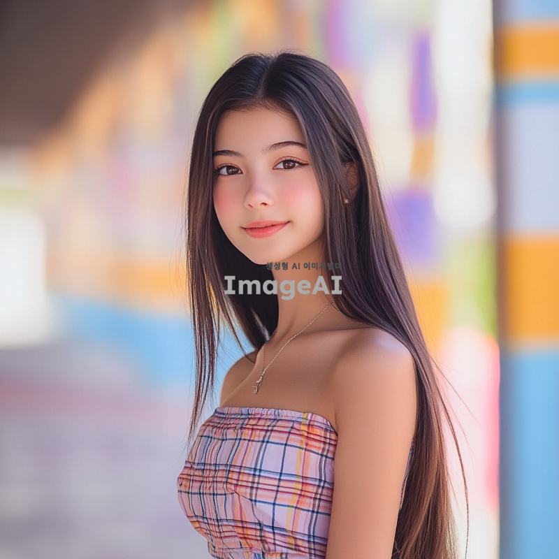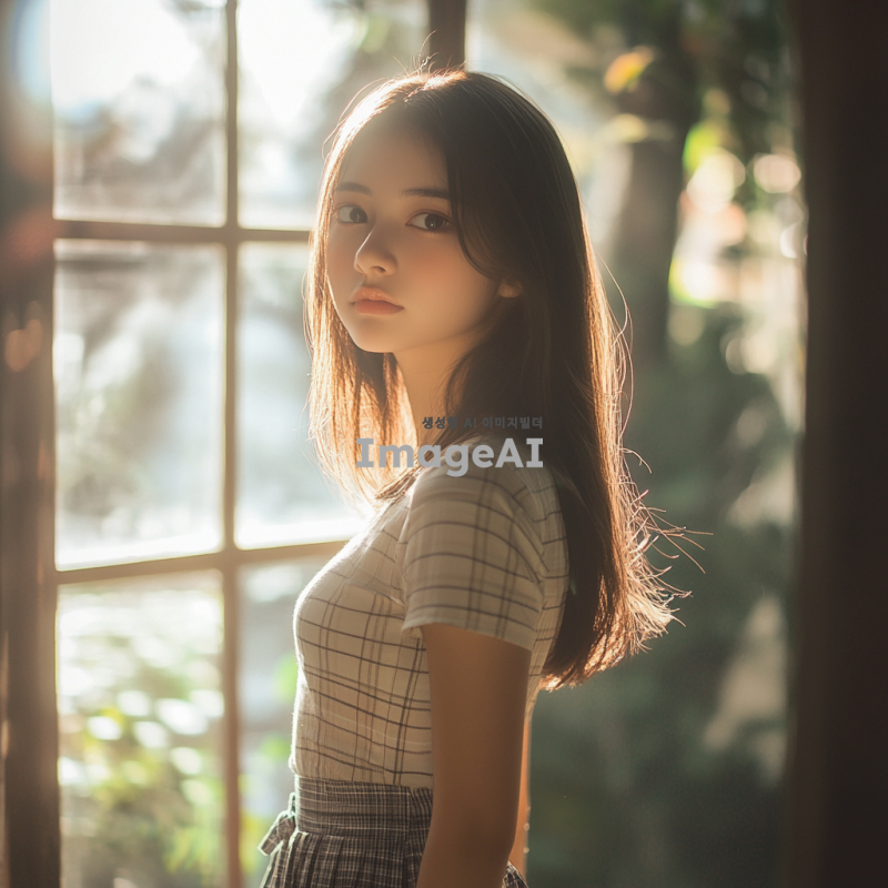 고등학생 여자, 예쁜 외모, 짧은 셔츠와 짧은 치마를 입고 있는 모습, 긴 생머리 스타일, 밝고 화사한 배경, 자연광이 비치는 분위기, 활기차고 젊은 느낌.