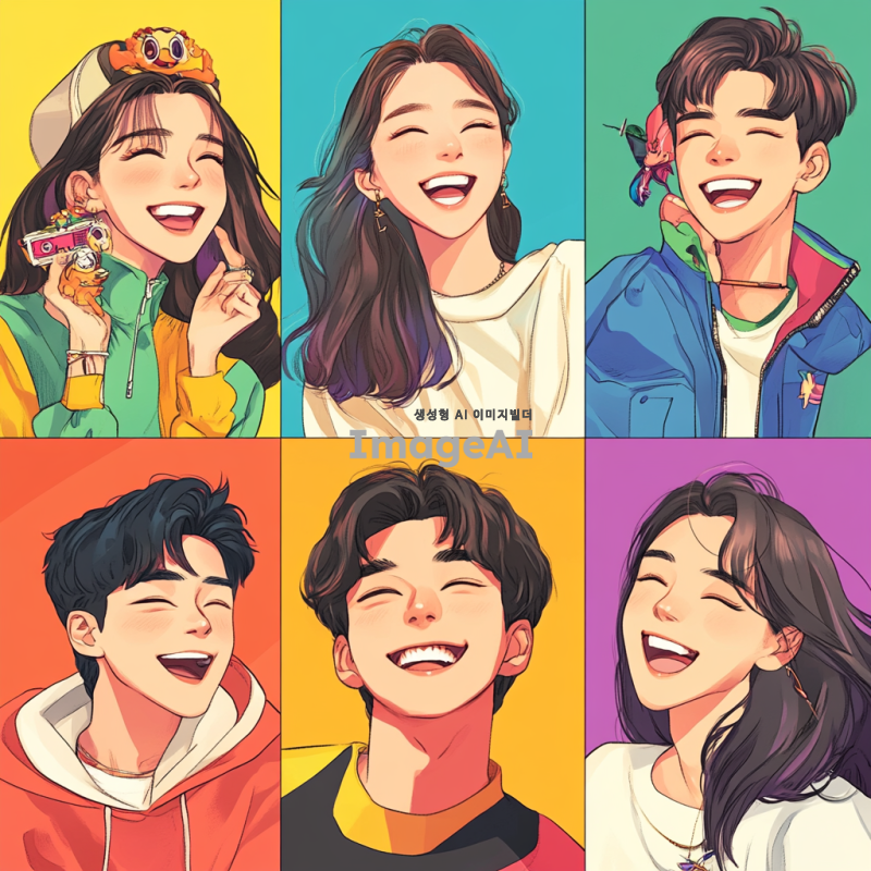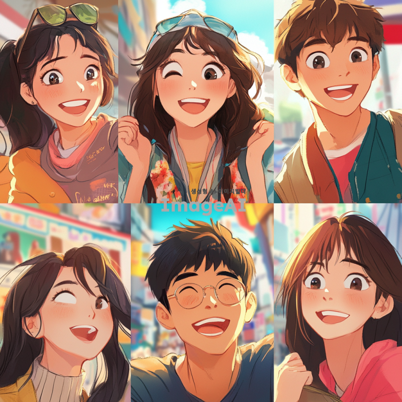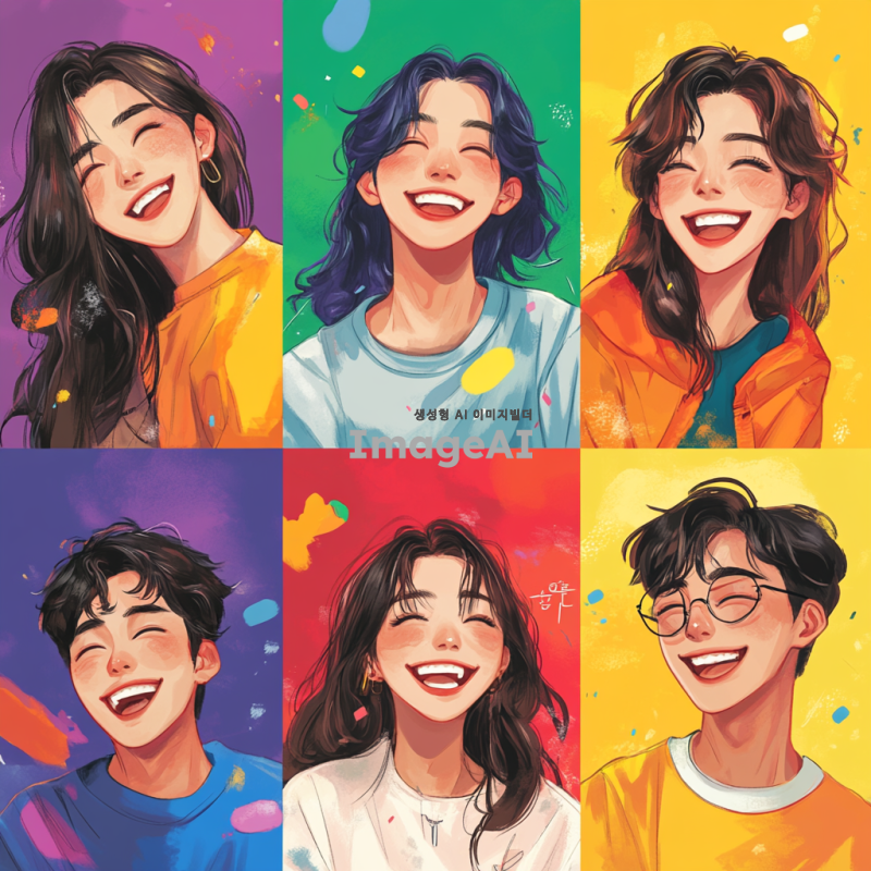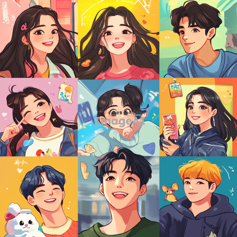 다양한 애니메이션 스타일의 캐릭터들이 웃고 있는 모습을 담은 프로필 사진. 한국인 남성과 여성 캐릭터들이 함께 어울려 즐거운 분위기를 연출하고, 배경은 화사하고 밝은 색상으로 가득 차 있어야 함. 각 캐릭터는 개성 있는 표정과 포즈를 취하고 있으며, 친근하고 유쾌한 느낌을 주는 이미지.
