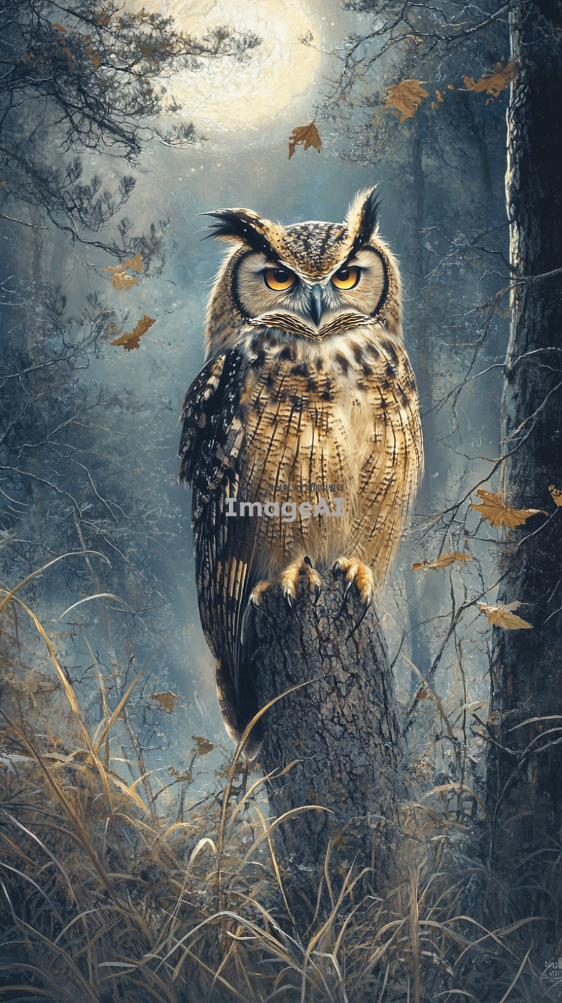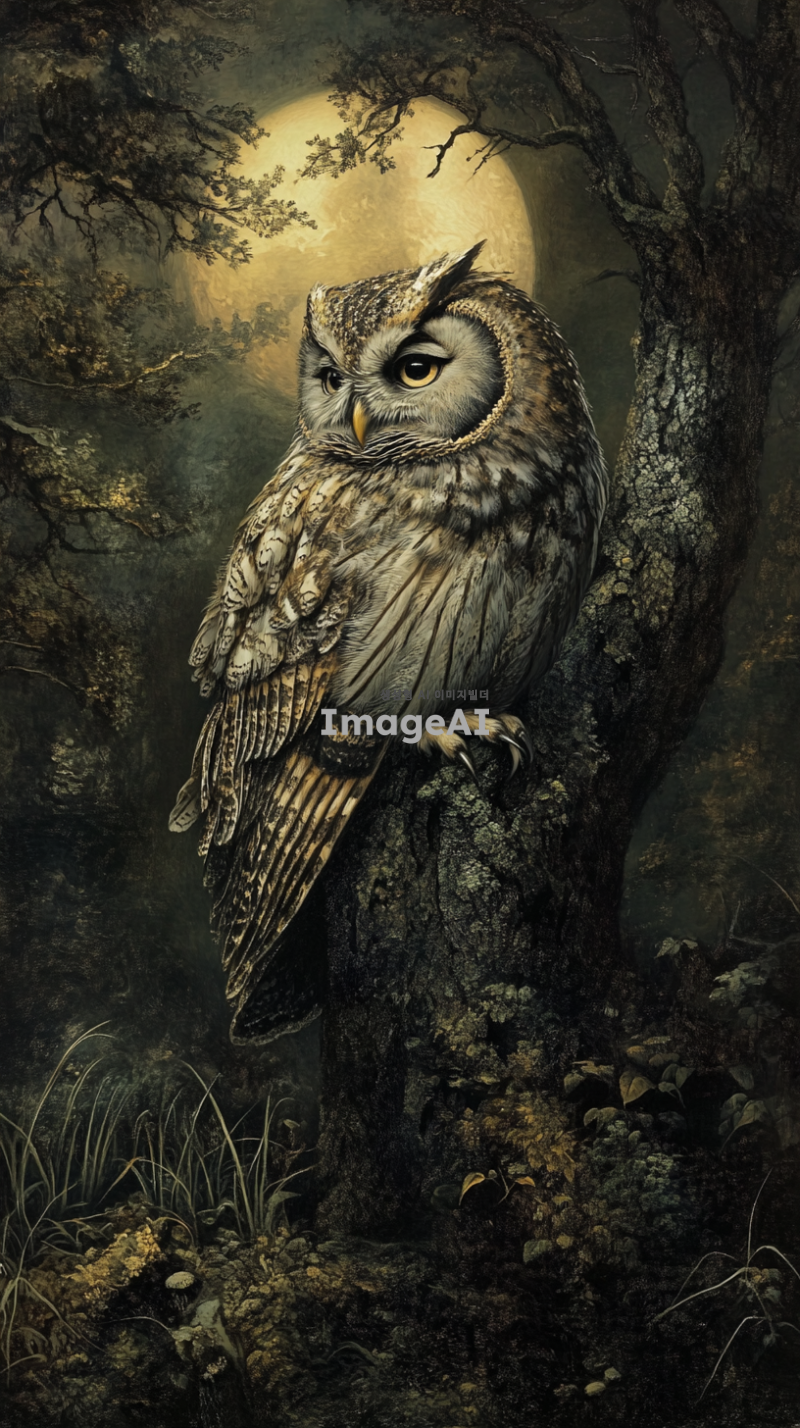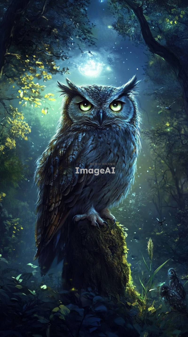 한국의 숲속에서 나무에 앉아 있는 부엉이, 부드러운 달빛 아래에서 깜빡이는 눈, 주변에는 나무와 풀들이 어우러져 있는 자연의 모습, 신비로운 분위기, 세밀한 디테일, 부엉이의 깃털 질감이 잘 드러나도록.