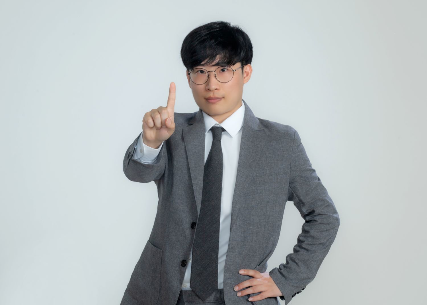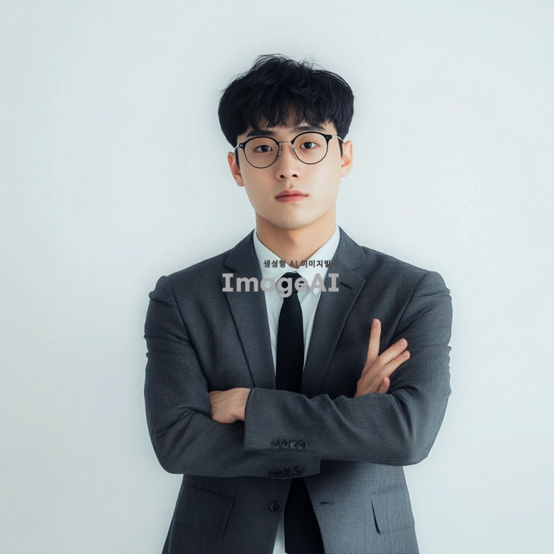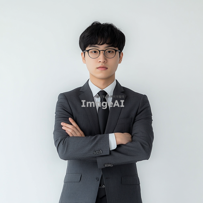 젊은 한국 남성이 20대 초중반으로, 안경을 쓰고 정장 차림의 수트와 넥타이 또는 블레이저와 슬랙스를 입고 팔짱을 끼고 흰색 배경에 서 있습니다. 그는 짧은 검은 머리를 가지고 있으며 면도하지 않았고 얼굴 털이 없습니다. 이 사진은 그가 카메라의 눈을 직접 바라보는 진정한 순간을 포착해야 하며, 전문적인 비즈니스맨으로서의 인상을 줍니다.