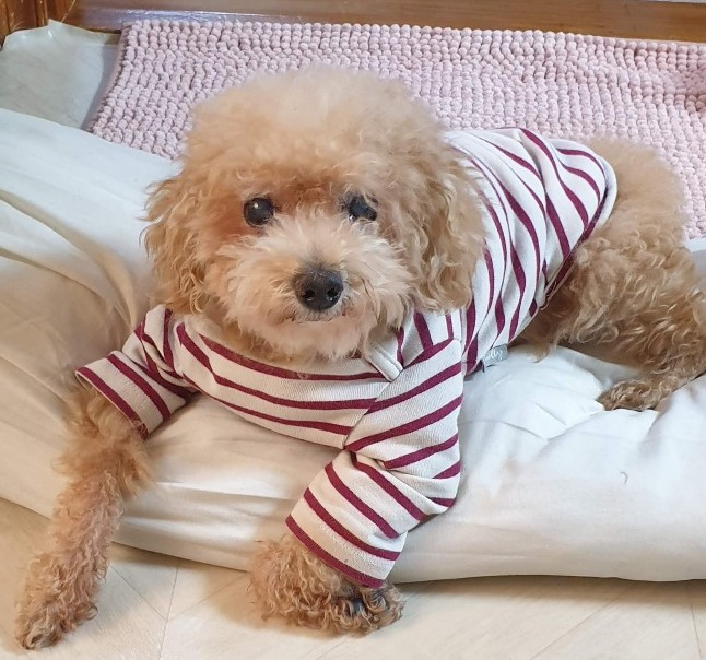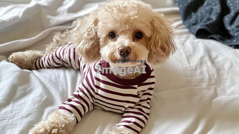 귀여운 크림색 푸들이 흰색과 마룬색 줄무늬 긴팔 티셔츠를 입고 침대에 앞발을 늘어뜨리고 누워 있으며, 캐주얼 스타일의 인스타그램 포스트를 위해 사진을 찍고 있습니다.