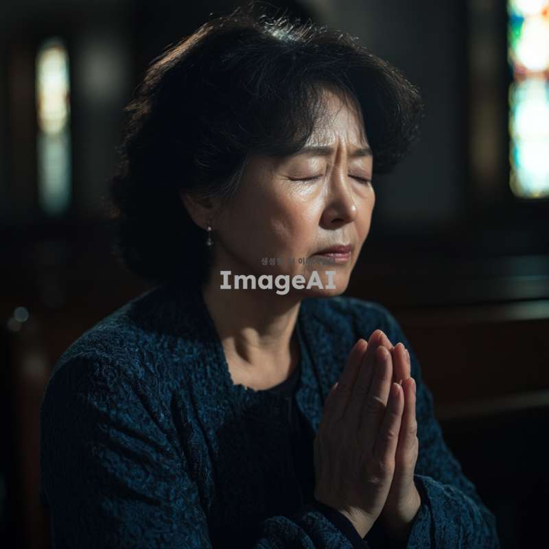 기도하는 한국 중년 여성의 모습, 조용한 교회에서 두 손을 모으고 깊은 기도를 드리는 모습, 부드러운 햇살이 비추는 장면, 평화롭고 경건한 분위기,여성뒤로십자가가보인다